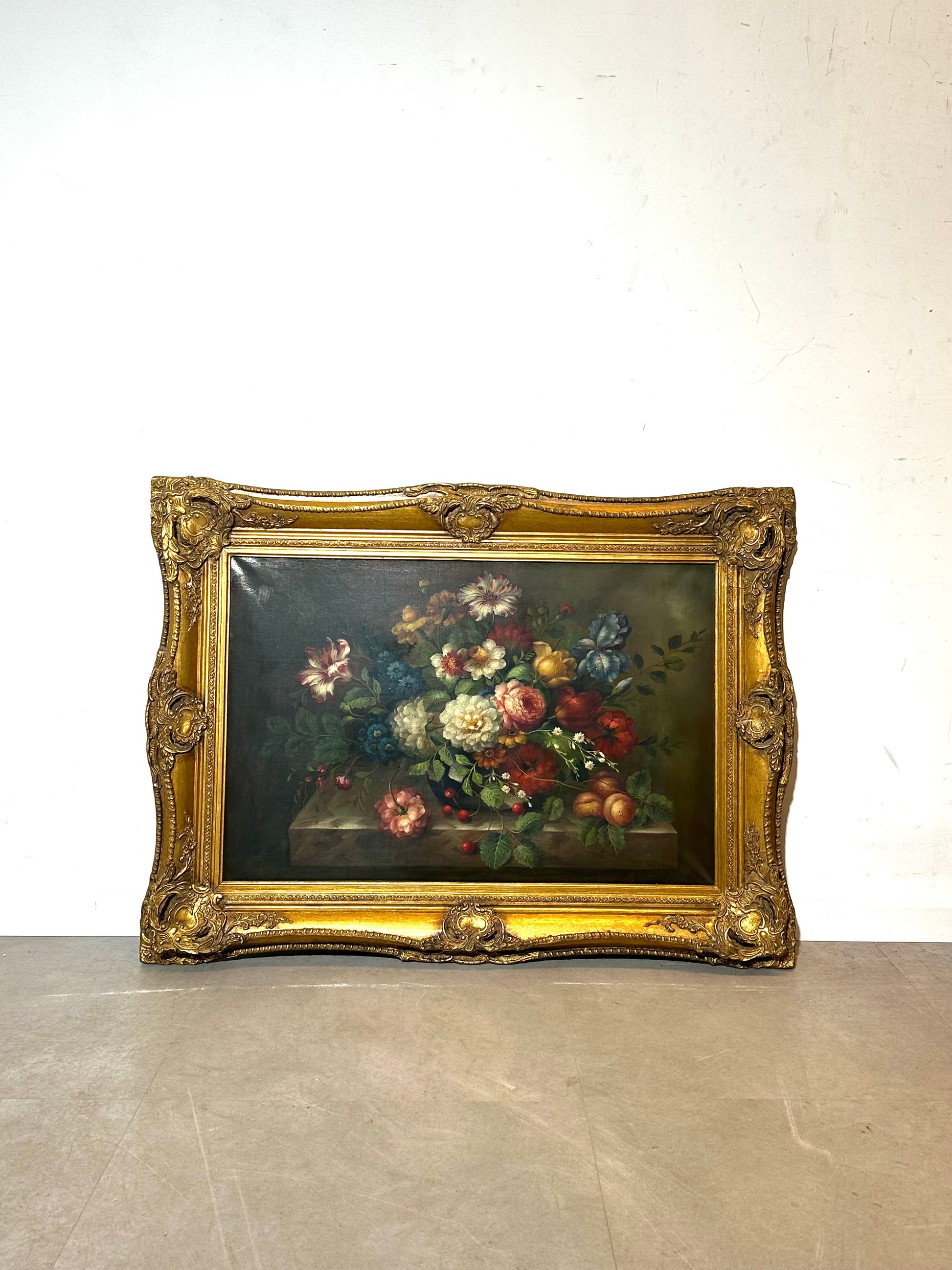 A richly detailed still life painting by L. Van Hove, executed in oil on canvas. The artwork features an abundant arrangement of flowers and fruit, painted in warm, deep tones with beautiful classical detailing.
