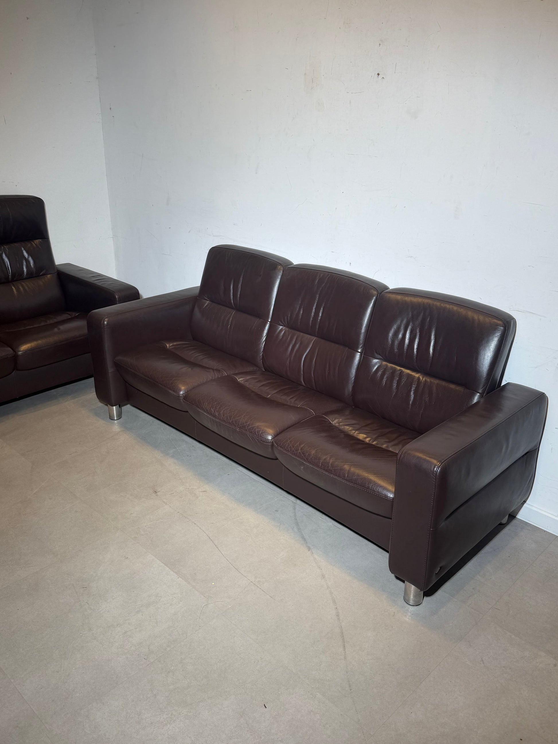Elegant and exceptionally comfortable Stressless sofa set consisting of a three-seater and a two-seater. Upholstered in high-quality dark brown leather, this set offers the renowned ergonomic comfort Stressless is known for, combined with a timeless, understated design.