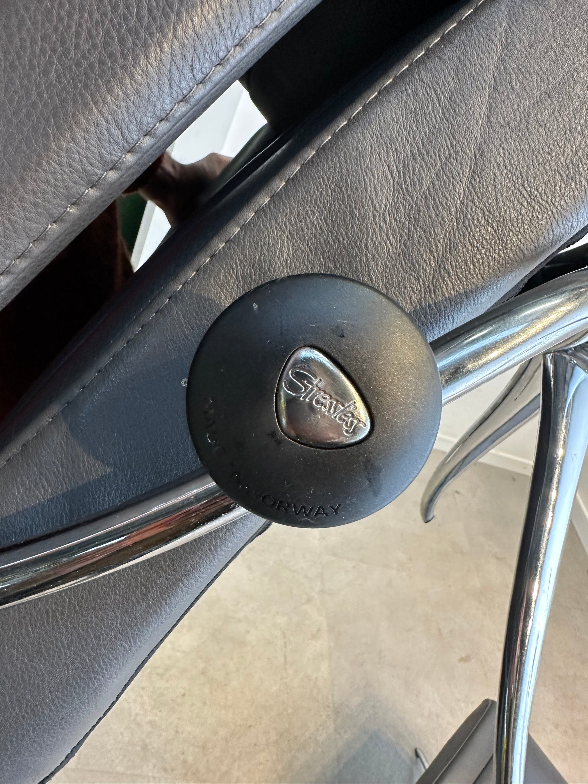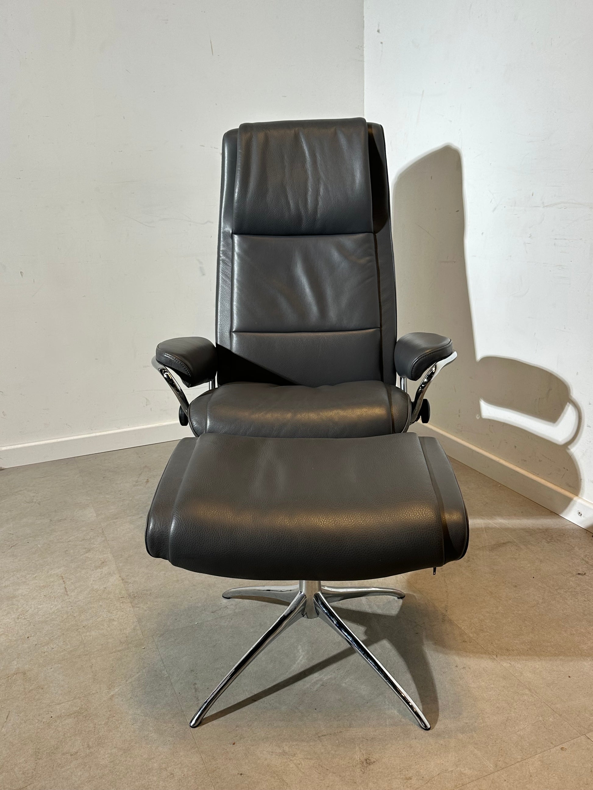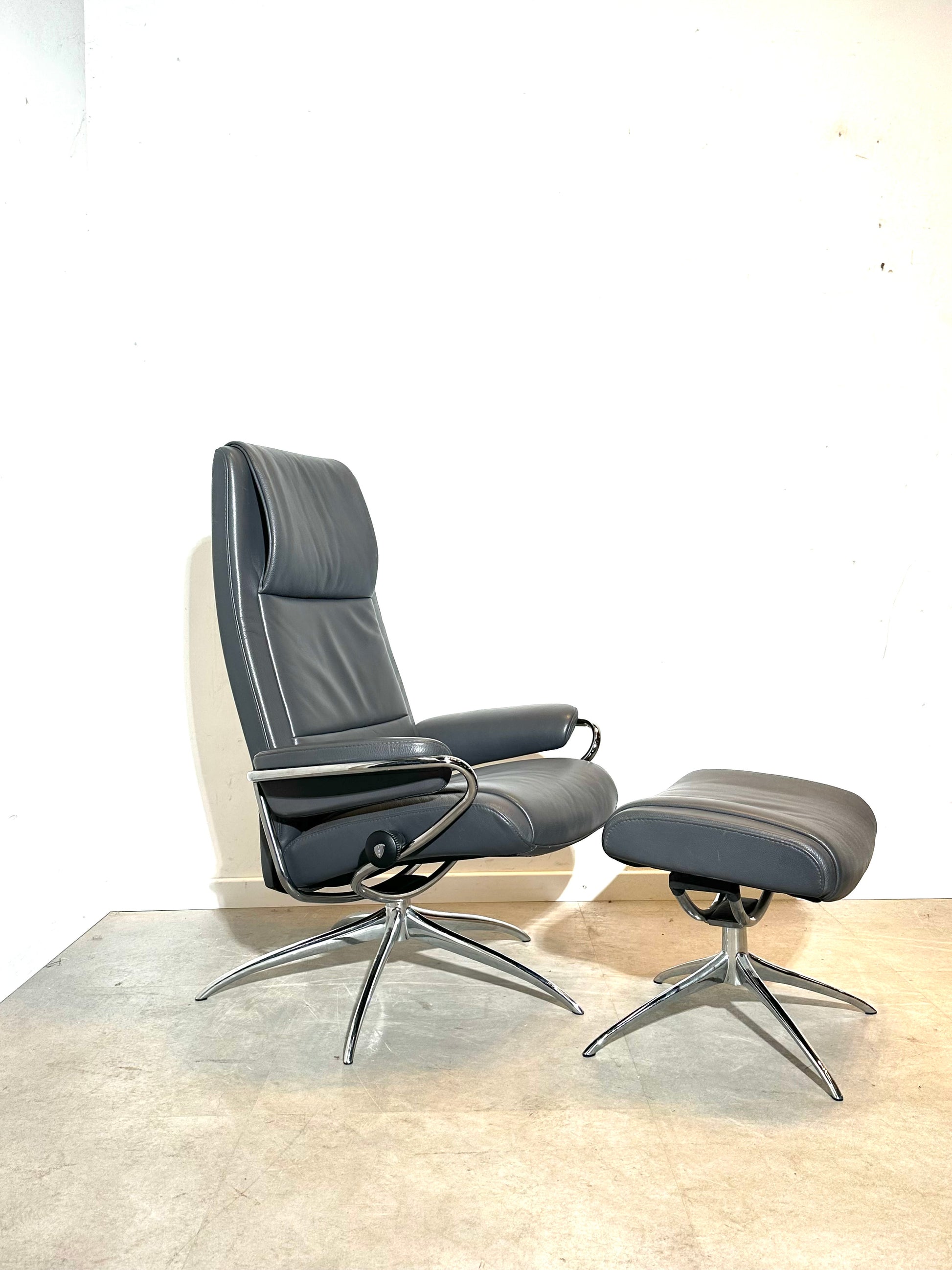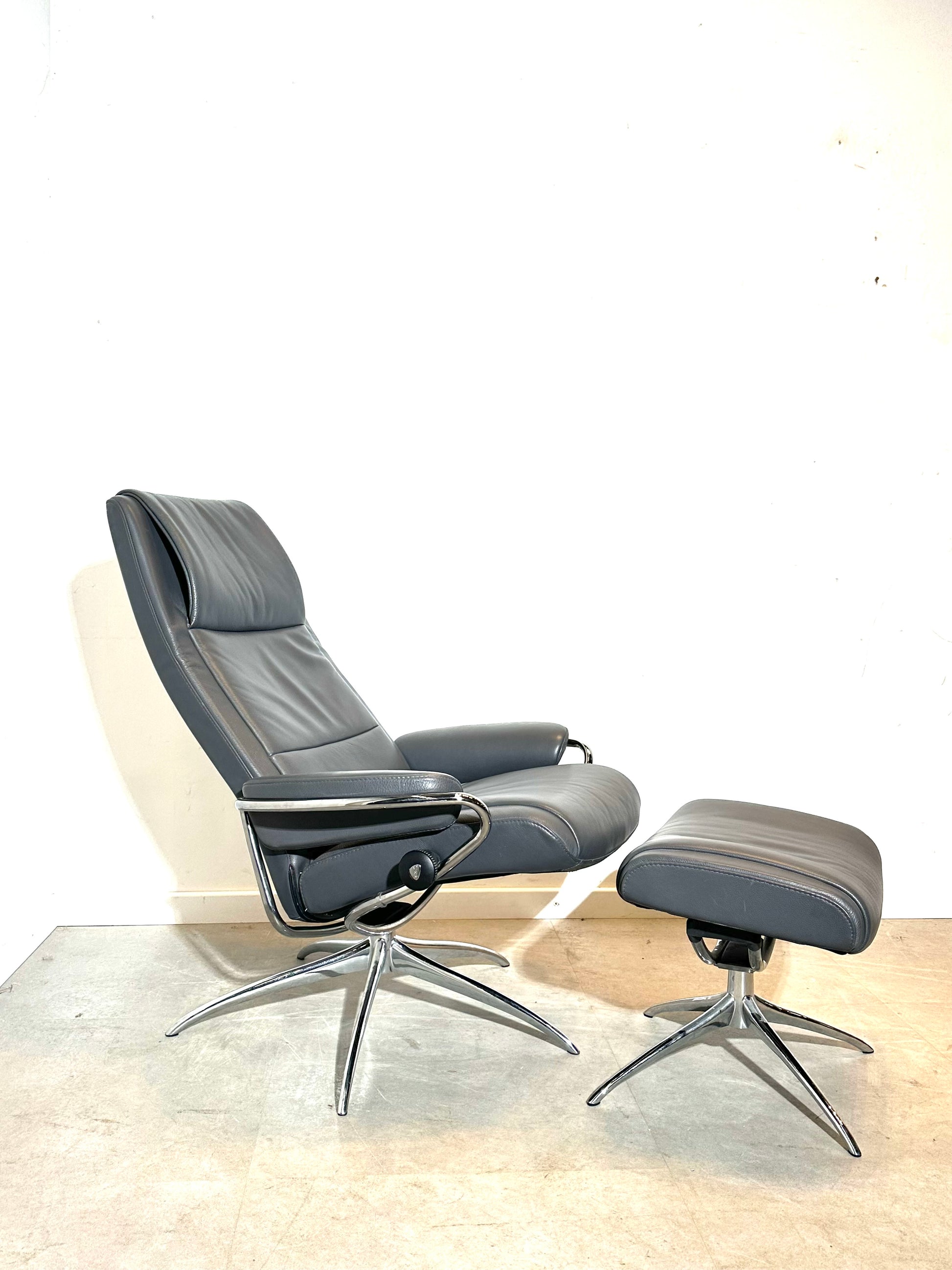 Elegant and comfortable Stressless City lounge chair with matching ottoman, designed for optimal ergonomic support and everyday comfort. This model features the well-known Stressless reclining and glide system, allowing the chair to smoothly adapt to your body position while providing excellent lumbar and neck support.