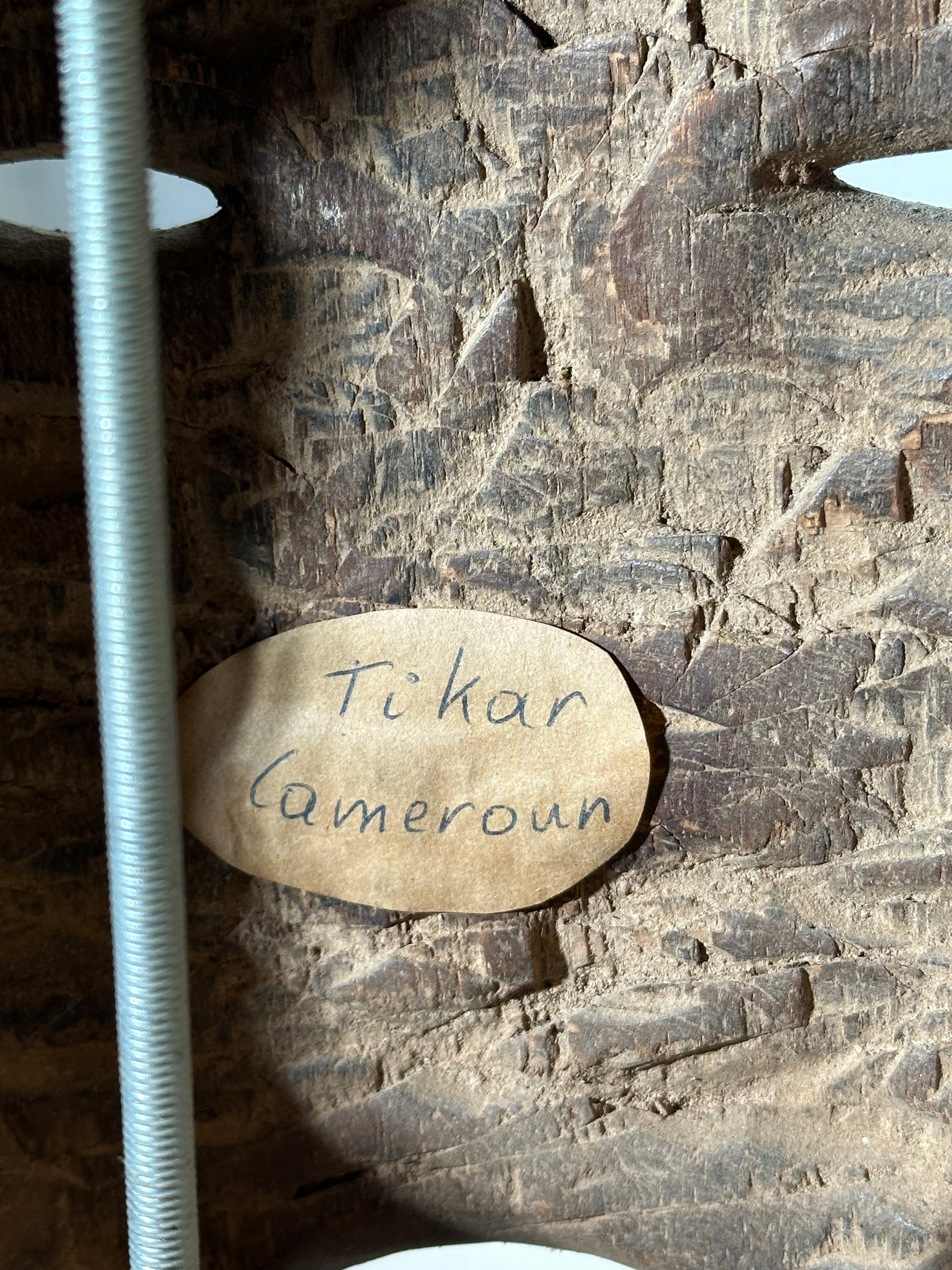 Along the perimeter, the mask is finished with traditional stitched leather bindings, a characteristic detail seen in Tikar masks, both functional and decorative. The interior shows clear hand-tool marks and an old handwritten label indicating its origin, further supporting its authenticity and age.