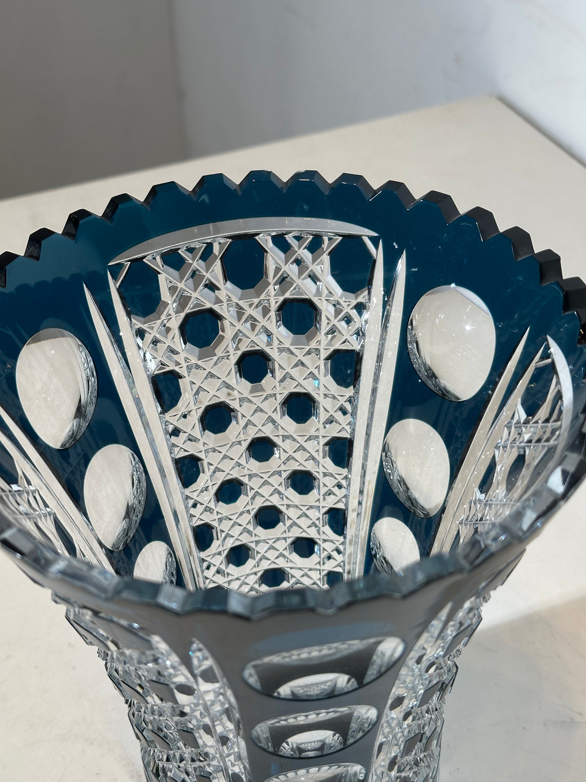 Impressive vintage crystal vase by Val Saint Lambert, Belgium, crafted in heavy cut crystal with a deep cobalt blue overlay. This striking piece features a sharply scalloped rim, alternating panels of intricate star and lattice cuts, and circular polished lenses that create a strong play of light and depth.
