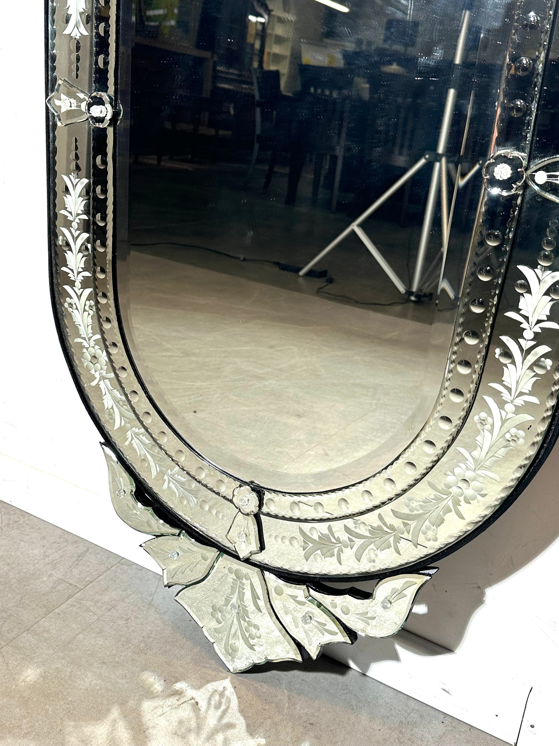 Striking vintage Venetian-style wall mirror made from smoked/black mirrored glass panels, richly decorated with hand-engraved foliate motifs and applied rosette details. The arched central mirror is framed by a sculptural crown top and a decorative base, giving it a dramatic, elegant silhouette. A perfect statement piece for an entry hall, bedroom, dressing area, or above a console.