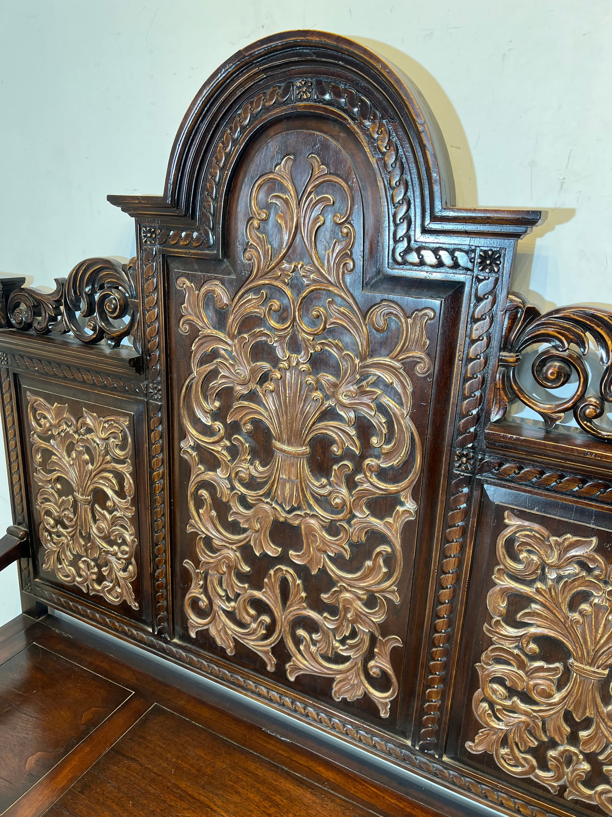 The high back with central arched crest and intricate relief carvings gives the bench a very architectural presence, making it an ideal statement piece for an entrance hall, hallway, or large interior space. The sides feature elegant scroll armrests, while the seat lifts to reveal a spacious storage compartment — perfect for blankets, shoes, or household items.