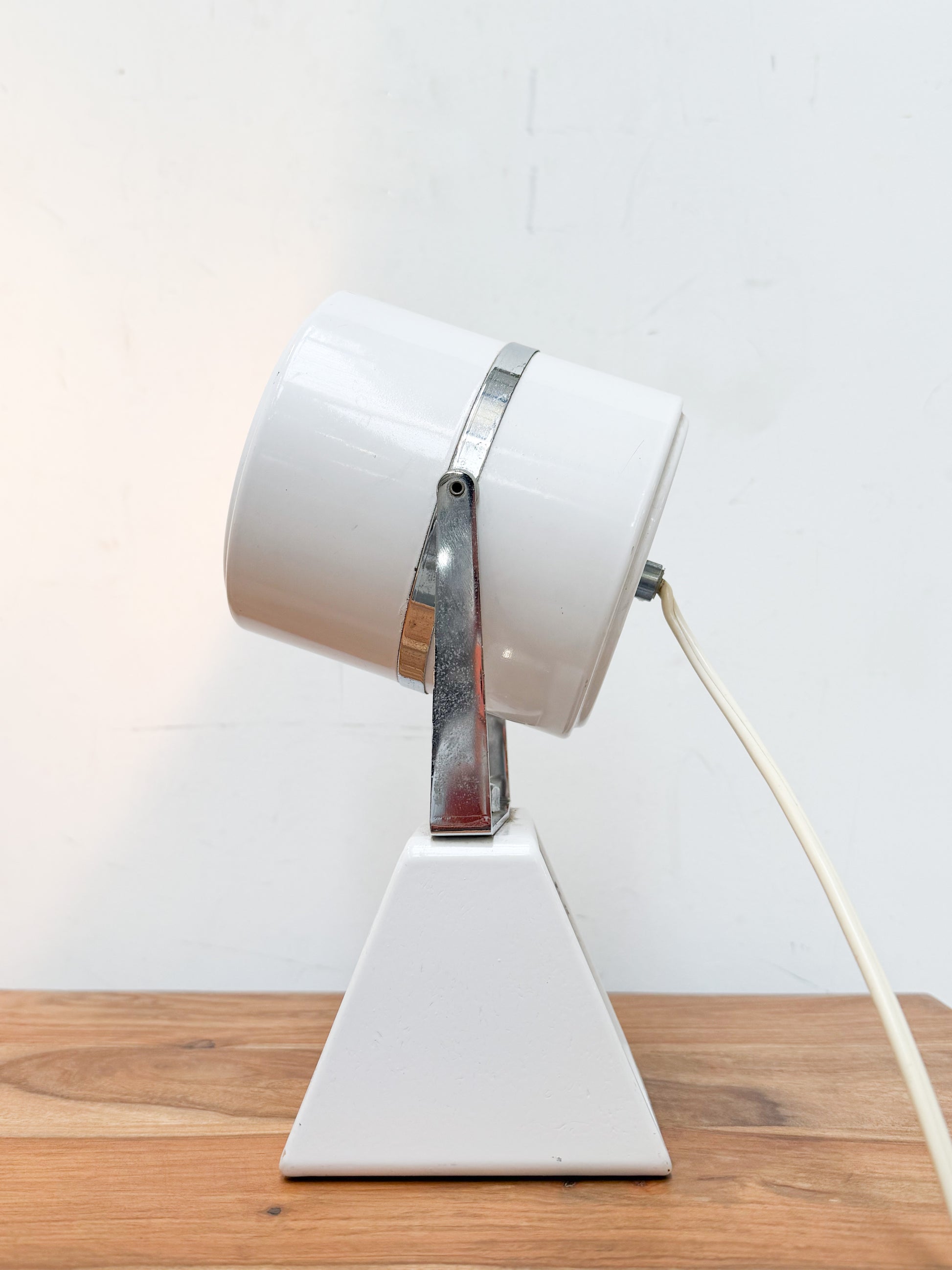 The white lacquered body paired with chrome elements gives it a clean, space-age aesthetic typical of 1970s design.