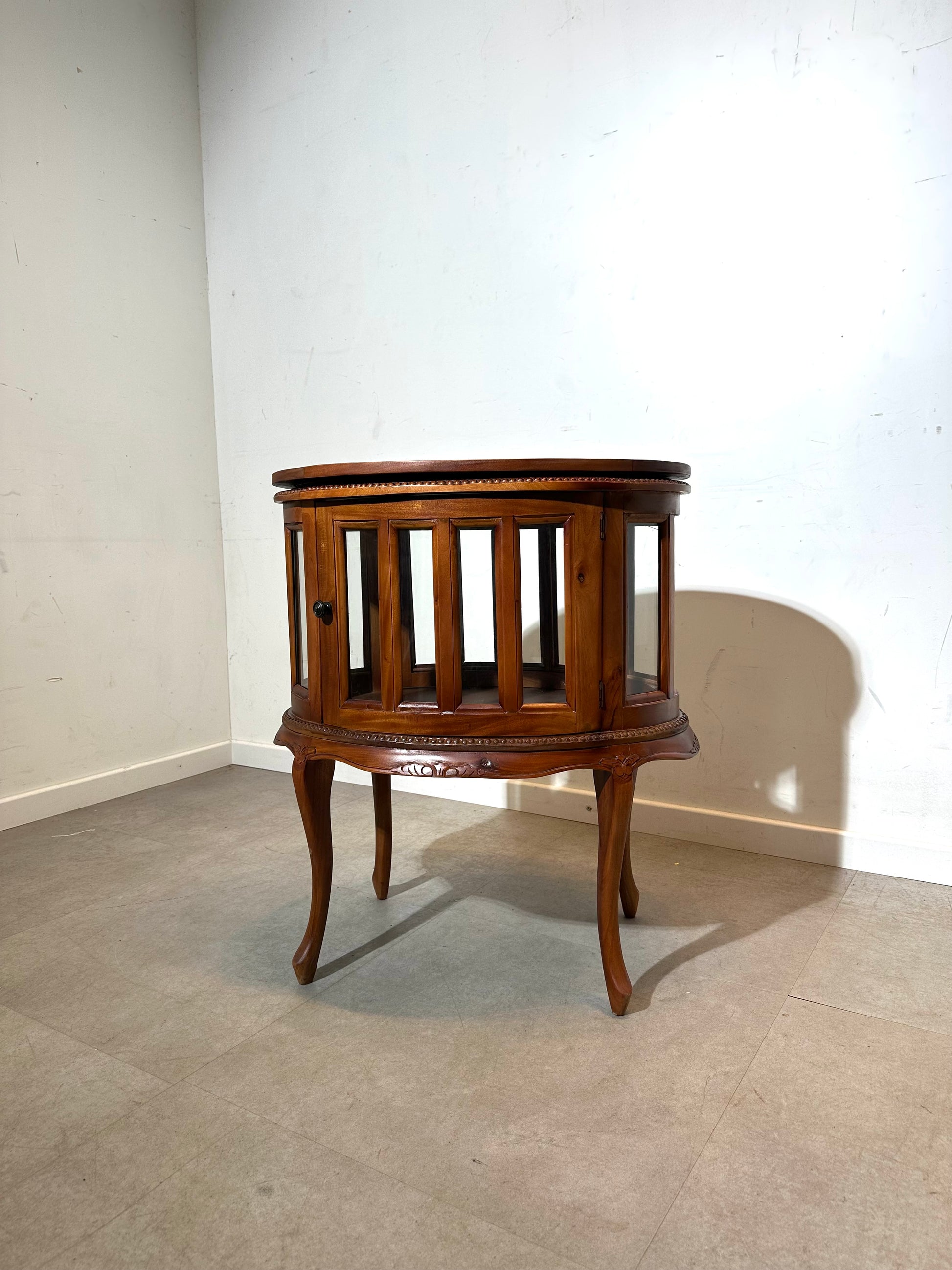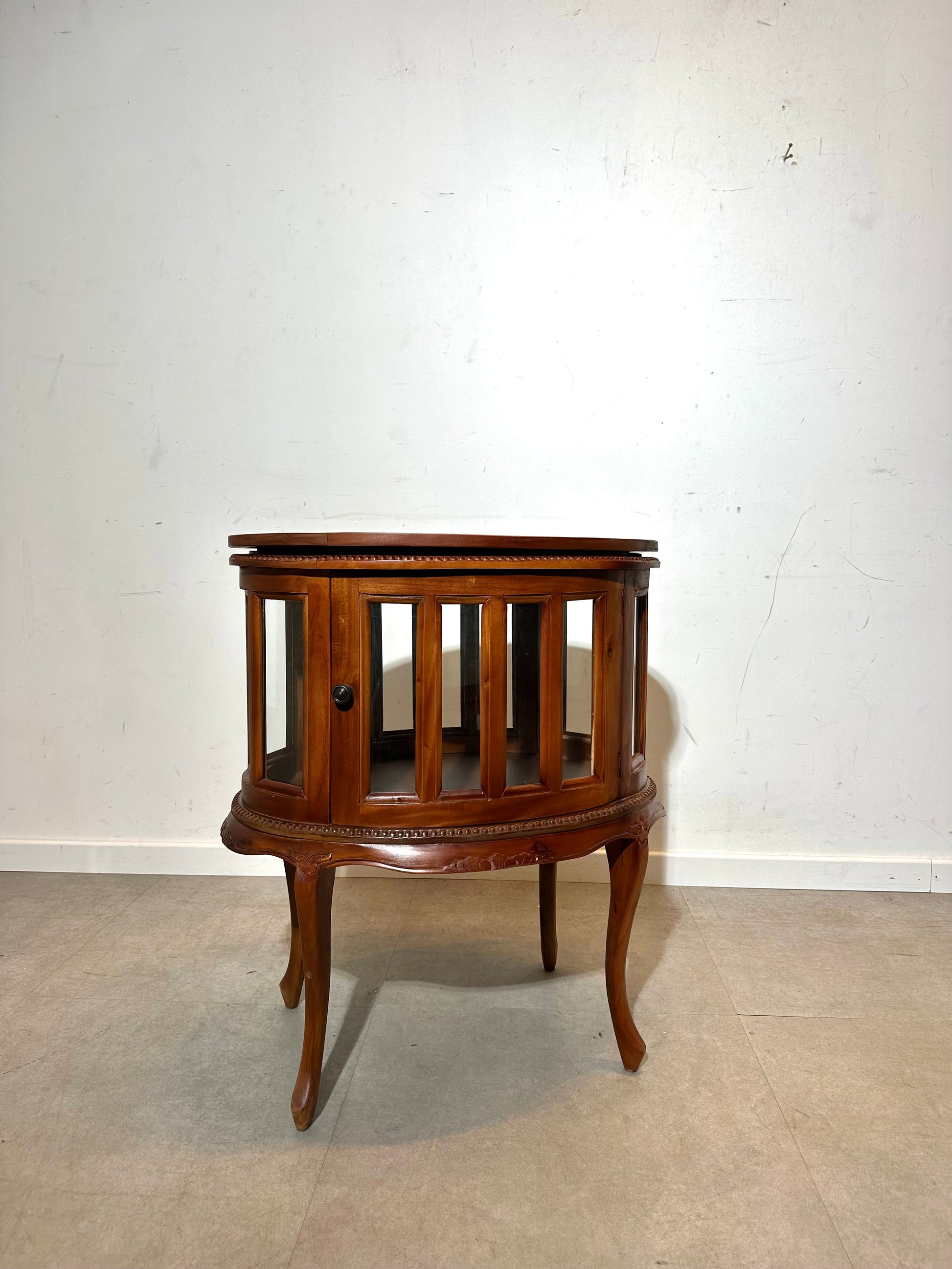 Crafted from solid wood, it features delicate carved detailing and curved legs, giving it a refined classic look. The upper section includes a removable oval tray top — perfect for serving or displaying décor — while the lower cabinet with glass panels provides a beautiful showcase for your favorite items.