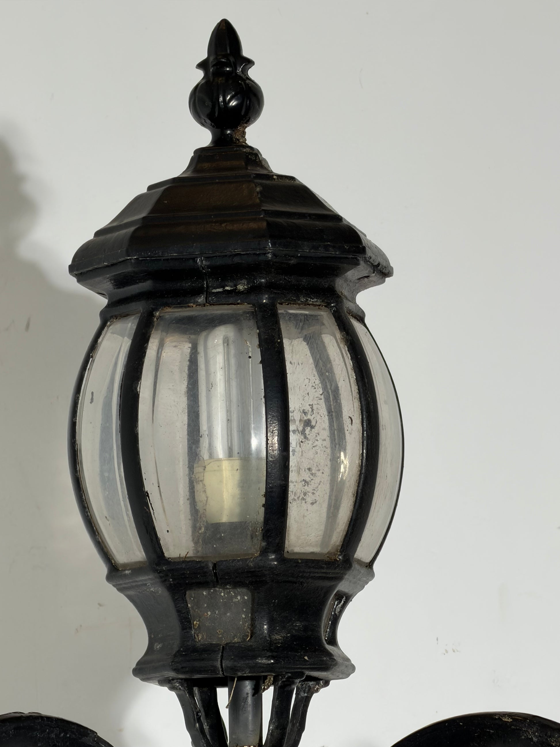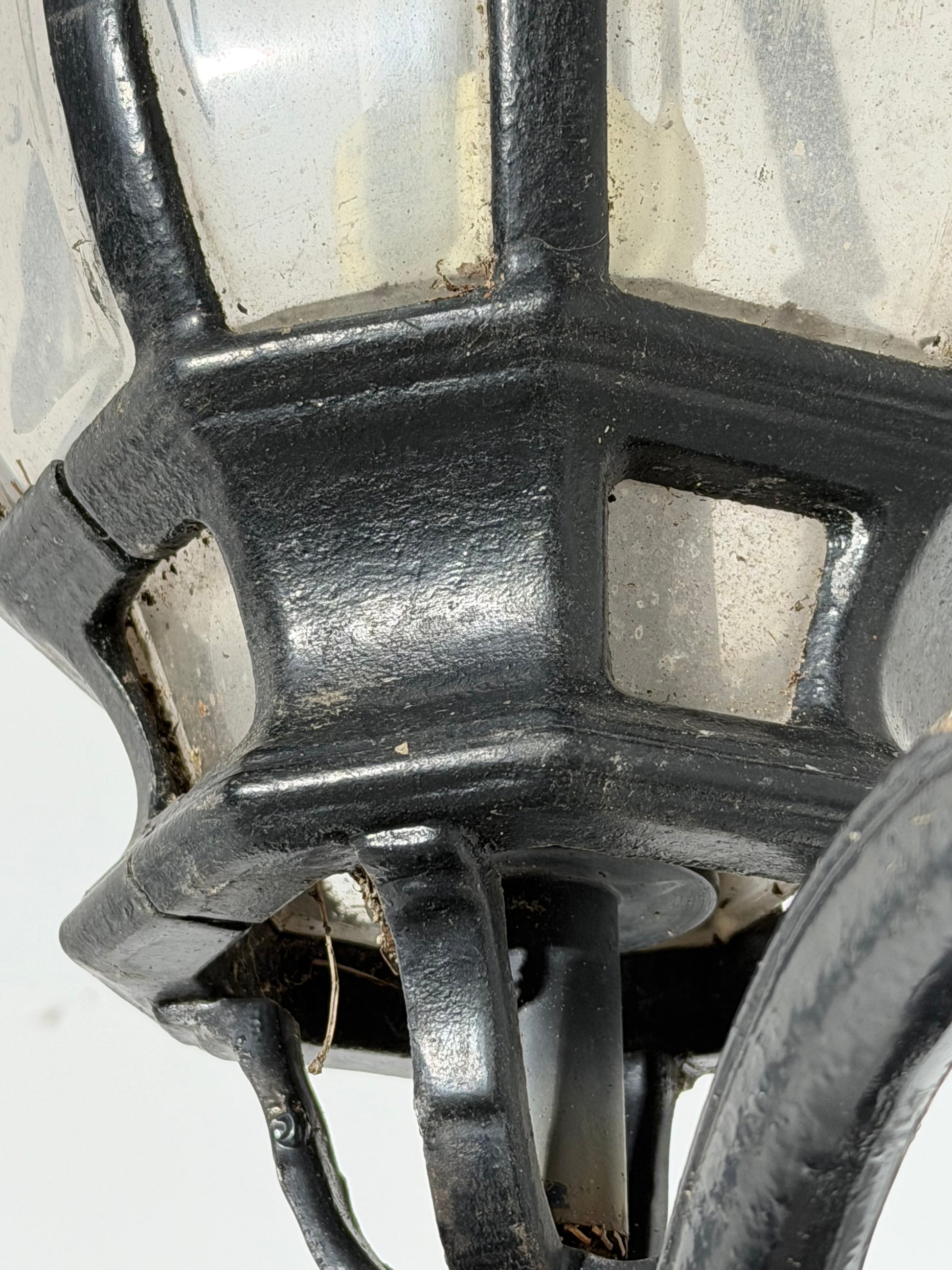 Authentic vintage street lamp post in cast iron, inspired by classic European public lighting. This impressive piece features a traditional lantern with curved arms and elegant detailing, making it a strong decorative statement for interiors, showrooms, gardens, or hospitality spaces.