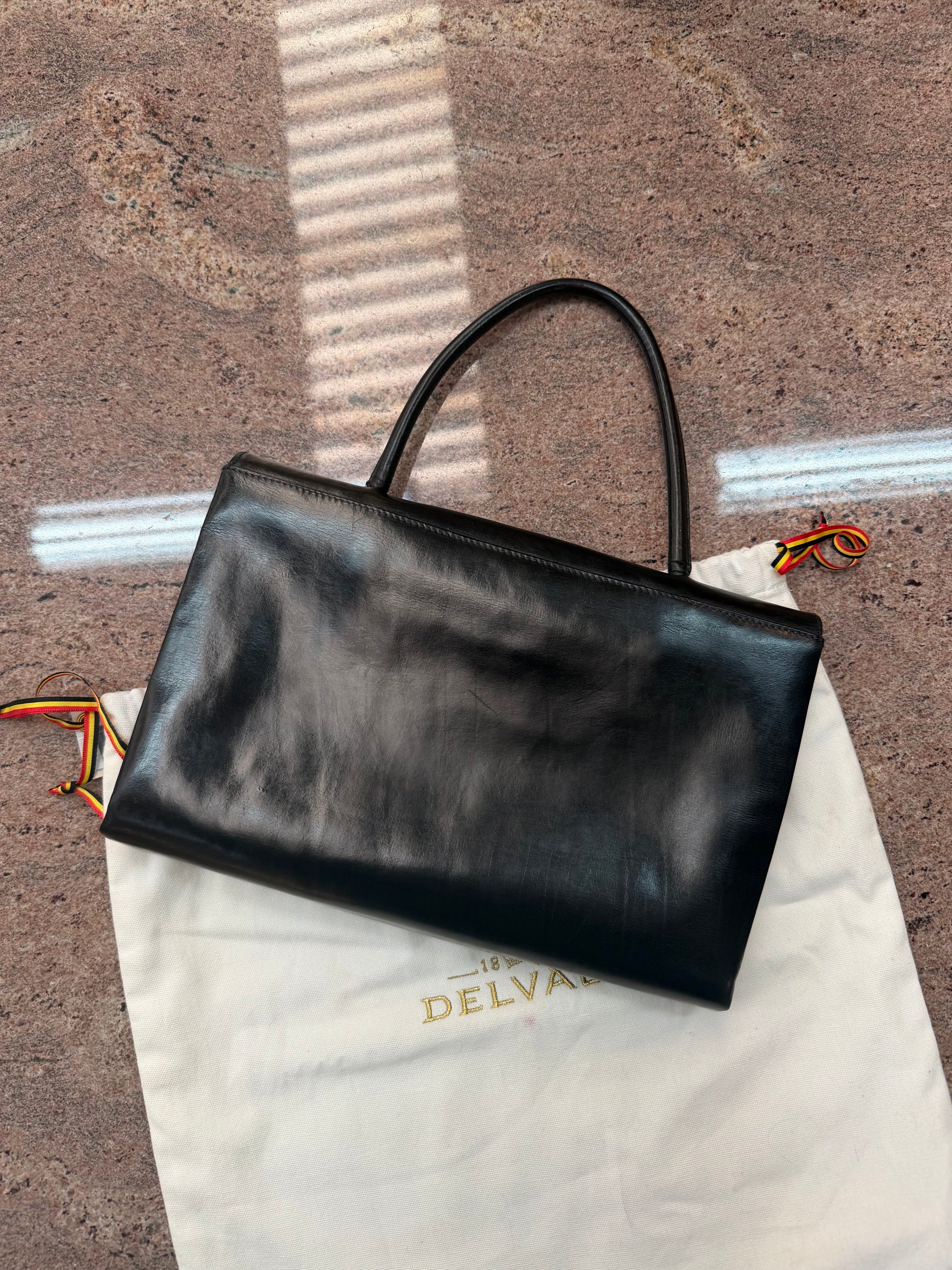 Vintage Delvaux “Œil de Chat” Handbag – Black Leather – 1960 Collection – 30 × 20 cm – With Dustbag & Delvaux Letter