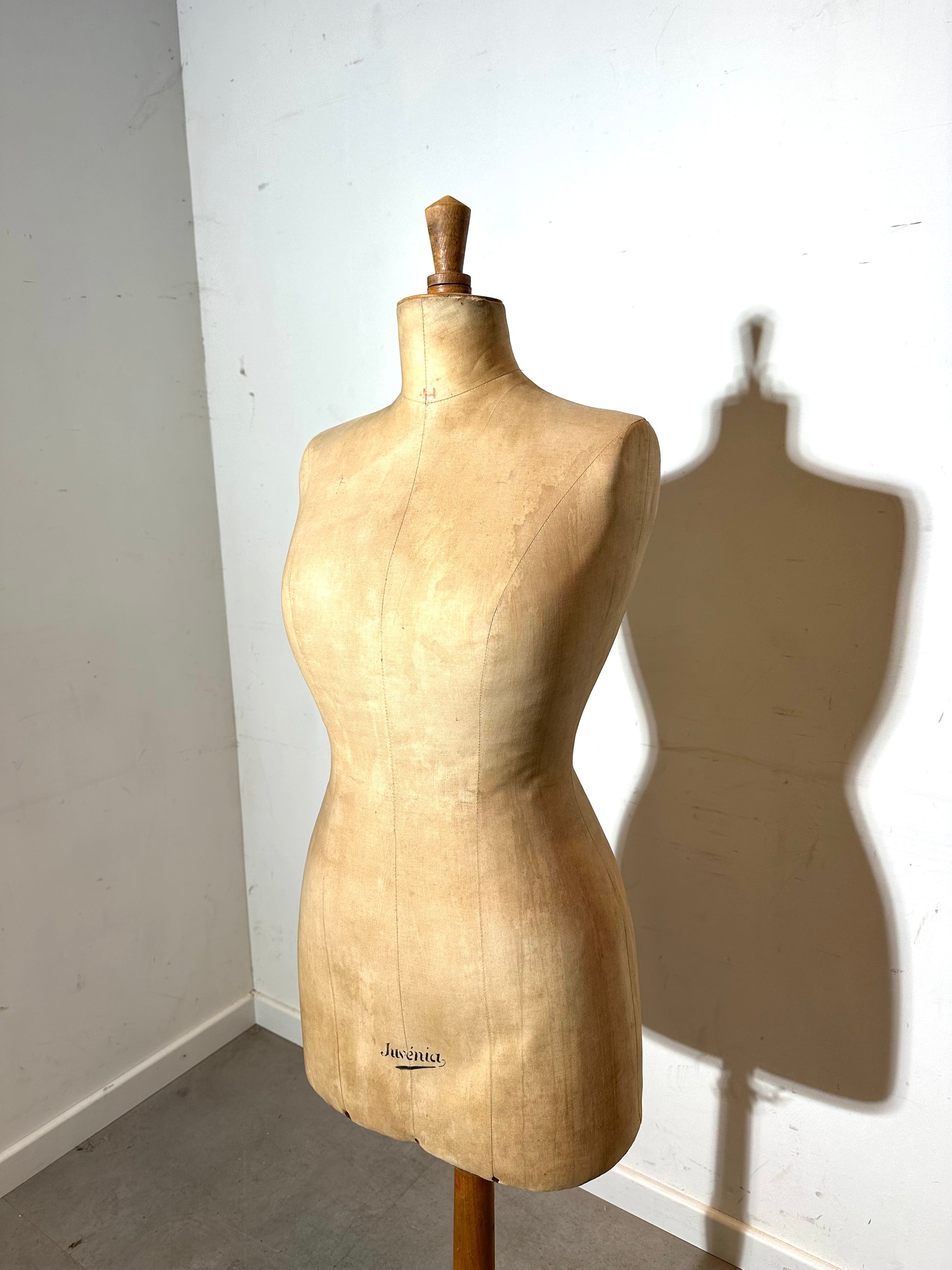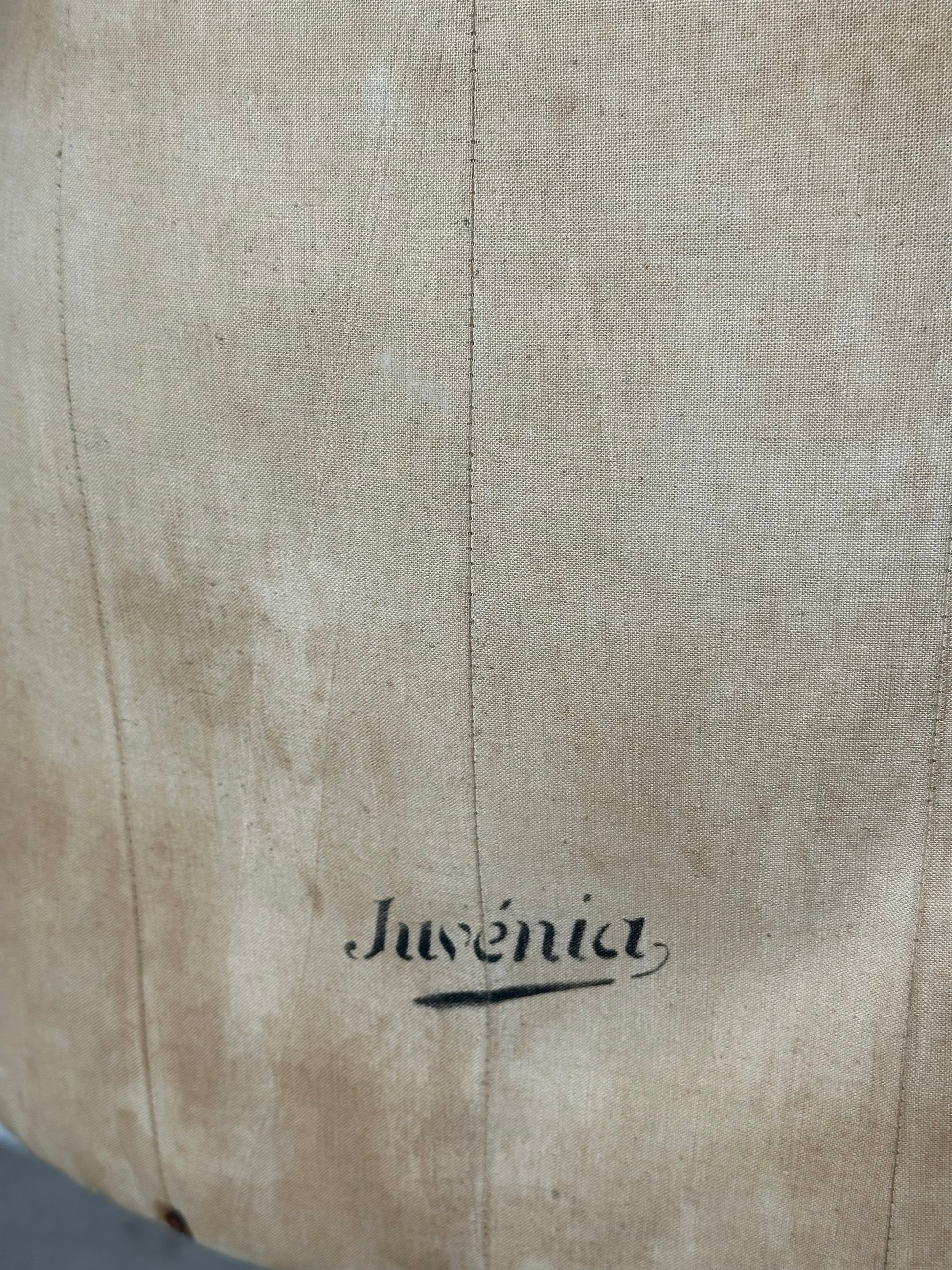 Authentic vintage dress form by Juvenia, featuring a classic feminine silhouette mounted on its original turned wooden stand. This atelier mannequin was originally used for tailoring and garment fitting and shows a beautifully aged canvas surface with visible patina, stitching lines and original maker’s marking.