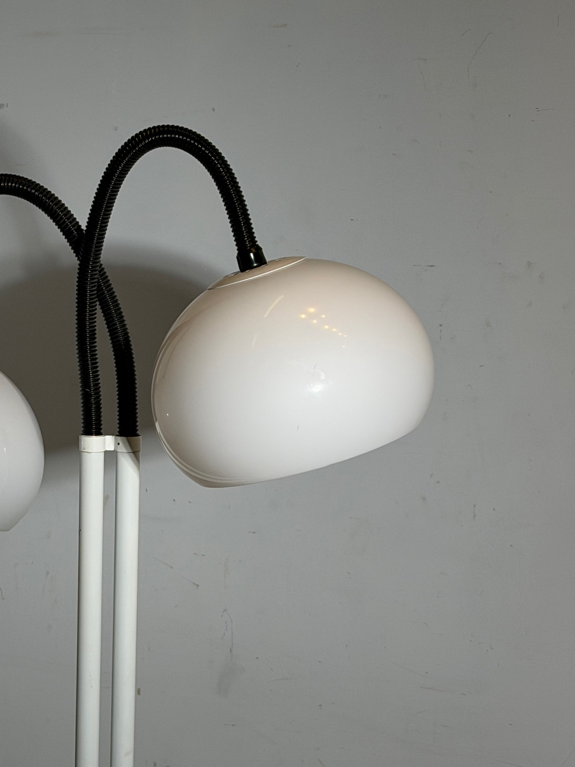 This striking vintage floor lamp was produced by Hala Zeist, one of the most respected Dutch lighting manufacturers of the mid-20th century. The lamp features two flexible black gooseneck arms with white mushroom-shaped shades, allowing the light to be directed exactly where needed.