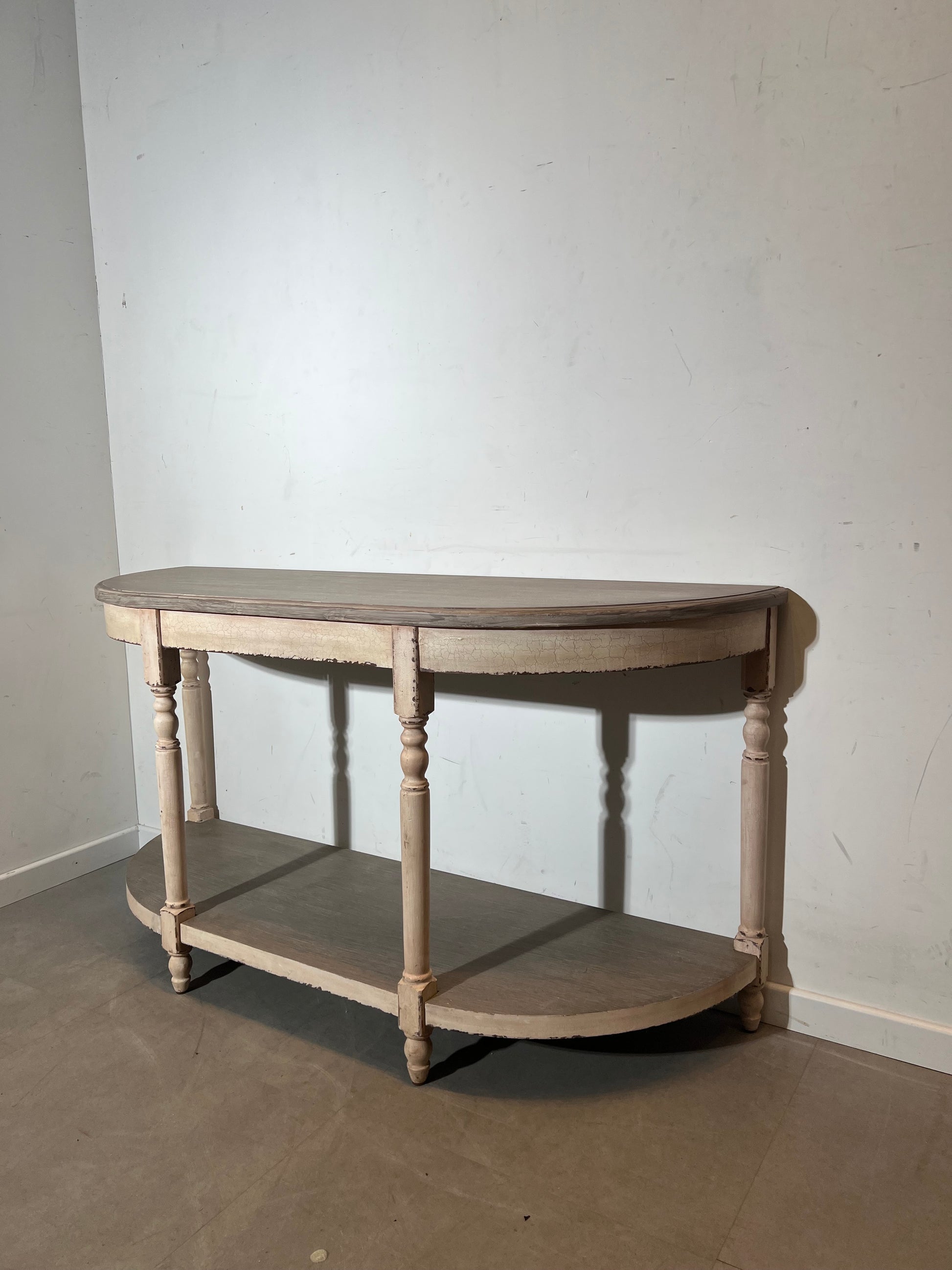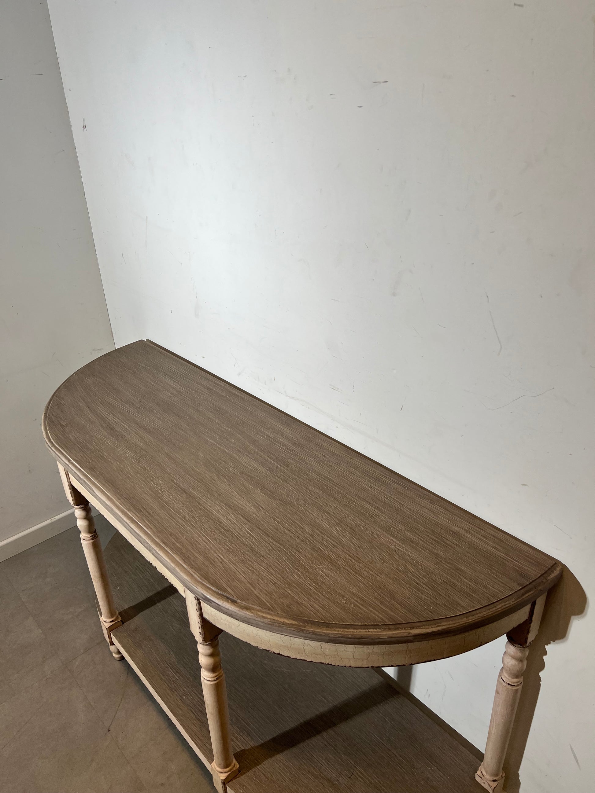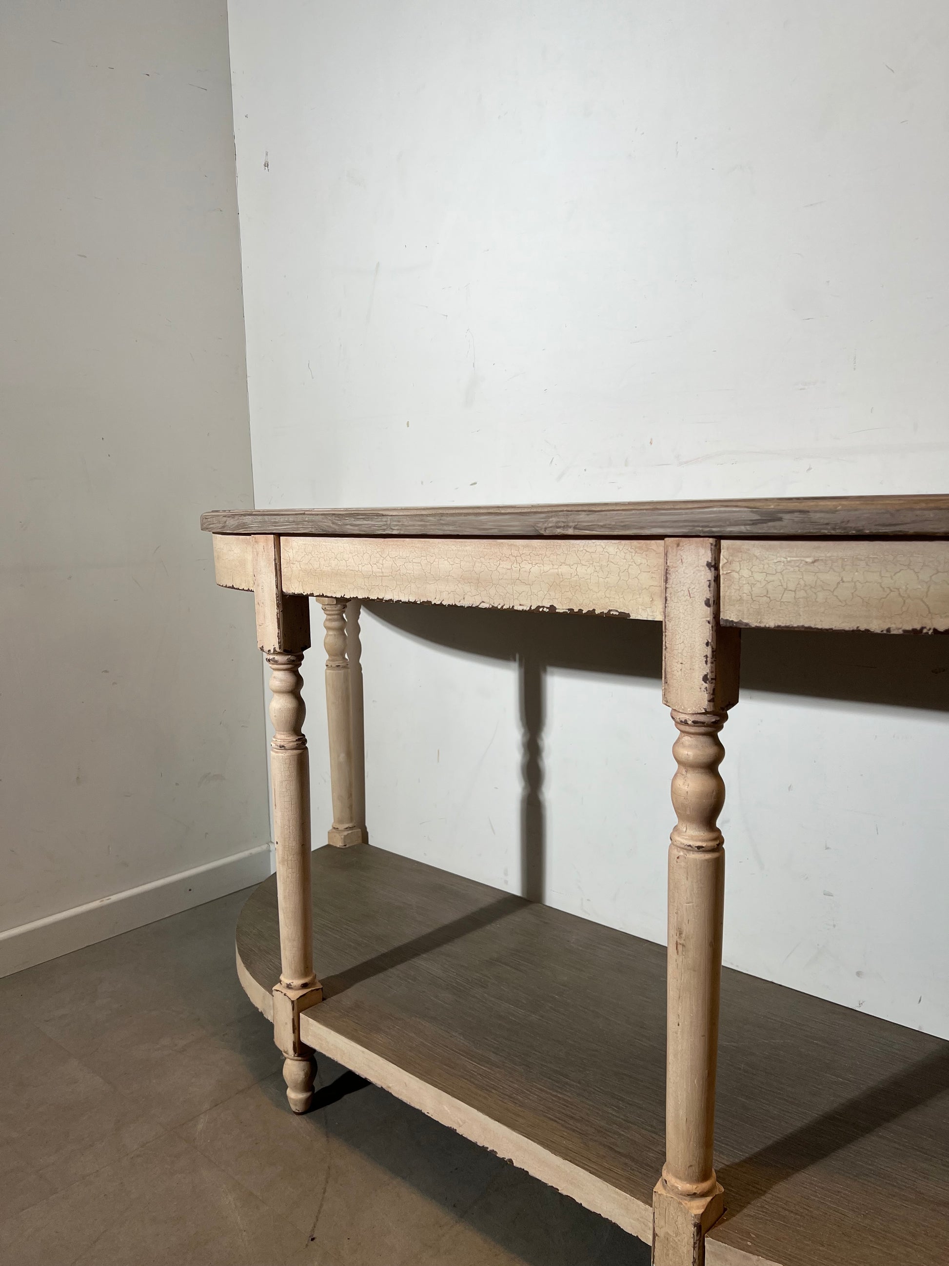 Beautiful vintage half moon console table with elegant turned legs and a charming distressed finish. The combination of the warm wood-toned top and crackle-painted cream base gives this piece a timeless, rustic character.