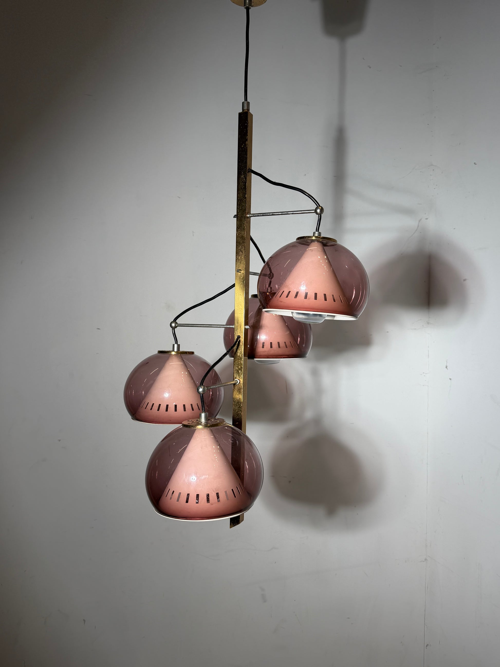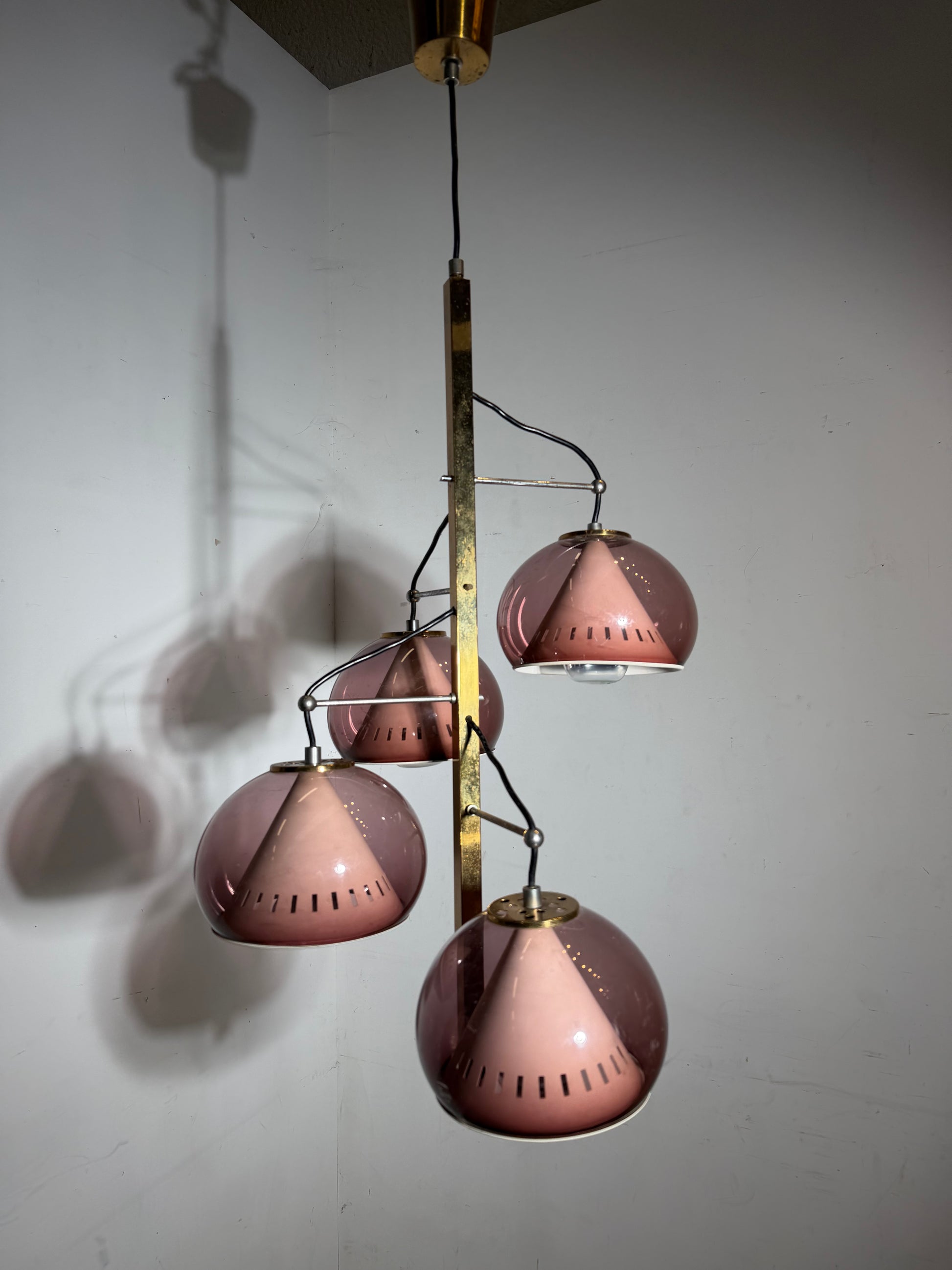 This elegant vintage chandelier was produced by Lamter Milano, an Italian lighting manufacturer known for its refined mid-century and modernist designs. The lamp features four beautifully shaped pink plexiglass shades suspended from an architectural brass vertical frame, creating a sculptural and highly decorative lighting piece.