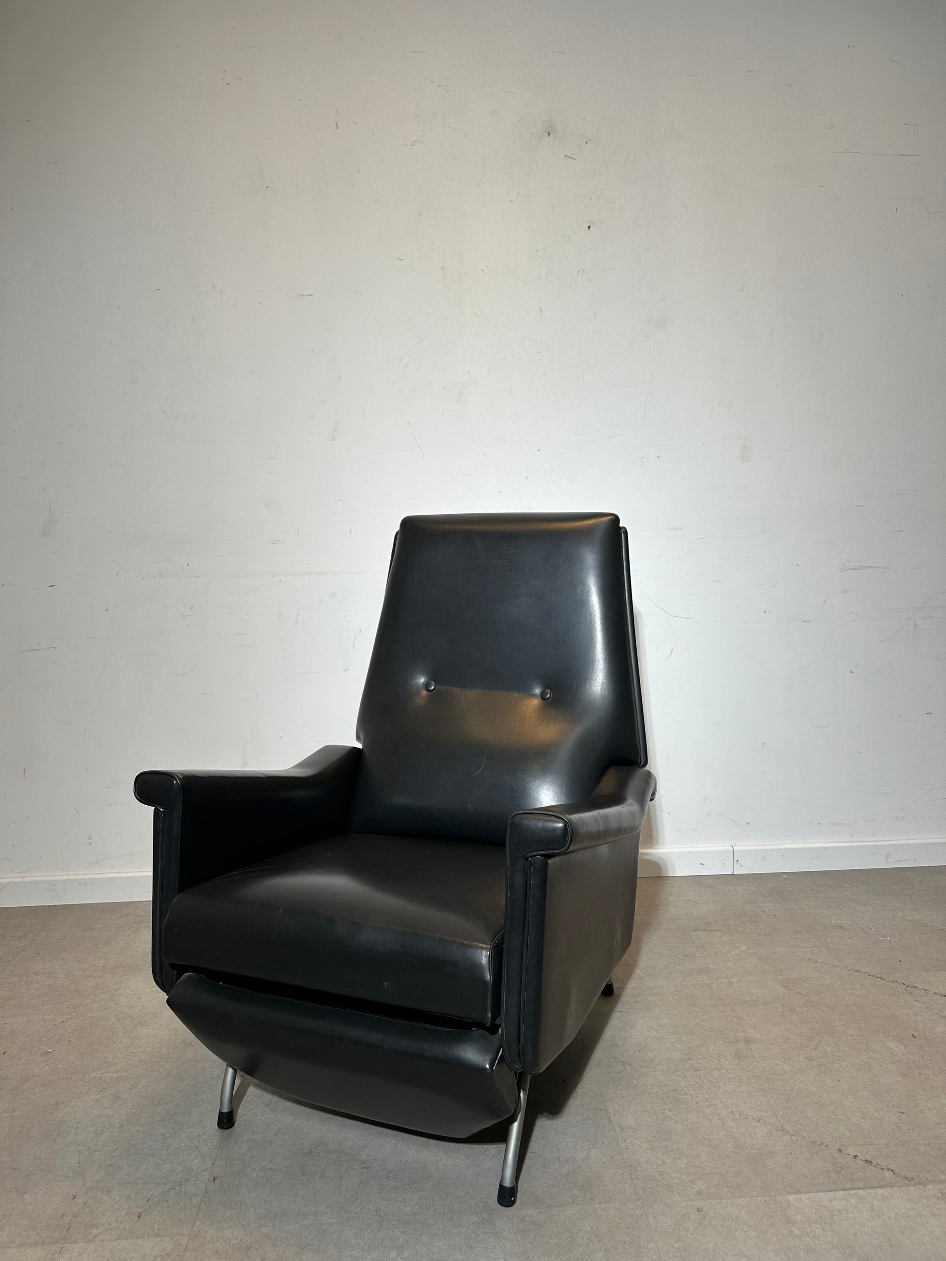 Add a touch of timeless elegance and comfort to your living space with this pair of vintage black recliner lounge chairs. Featuring a sleek mid-century design, these chairs combine style and functionality, perfect for relaxing in style.