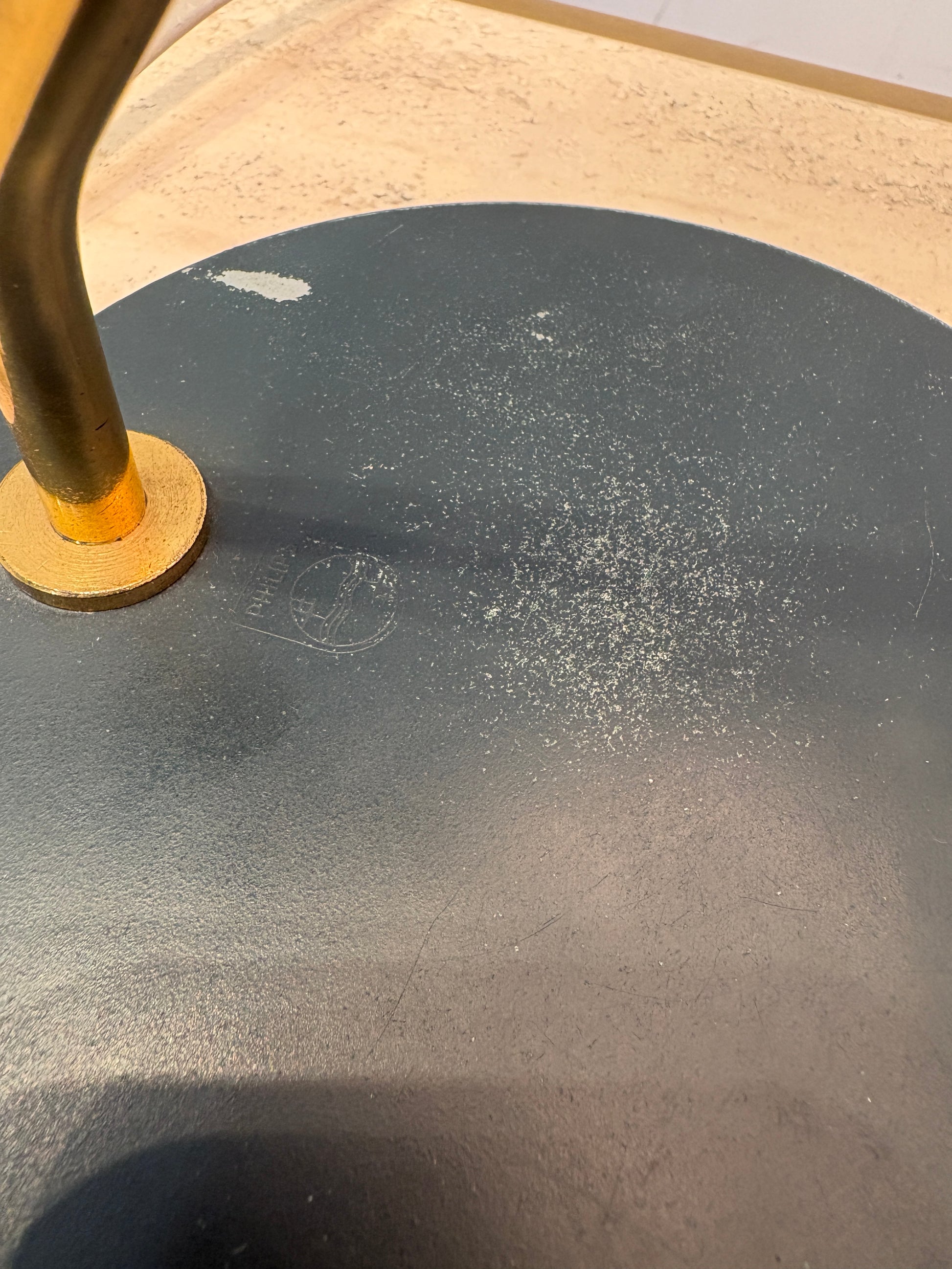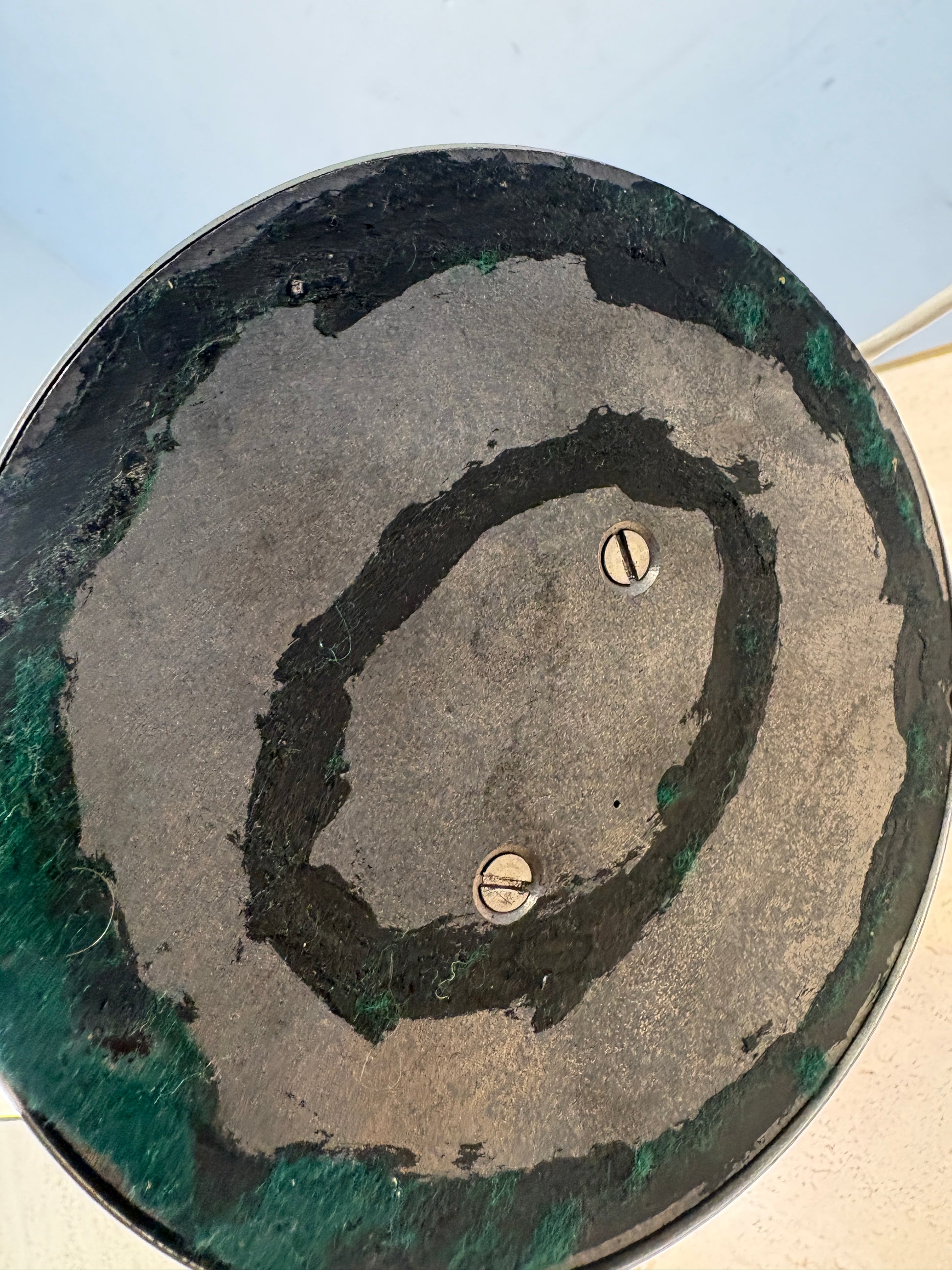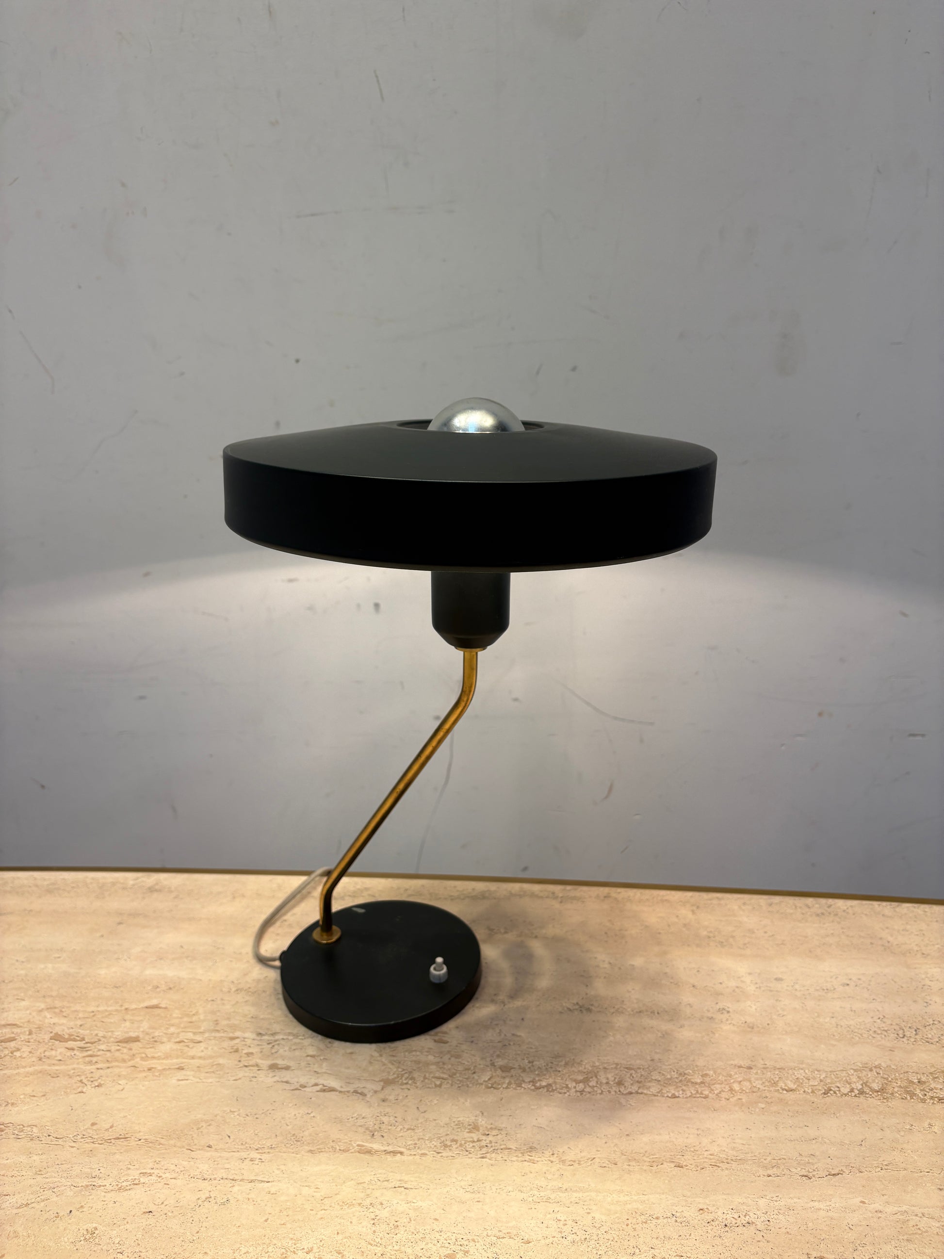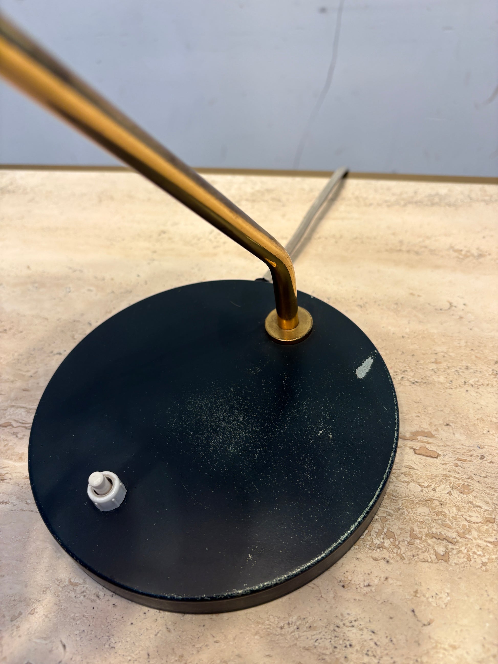 Rare ‘Romeo’ desk lamp designed by Louis Kalff for Philips, 1950s. This one has a dark green lacquered shade and base with a brass shaft in very good original condition. The metal base has some visible damage but adds to the authentic look and feel of the lamp.