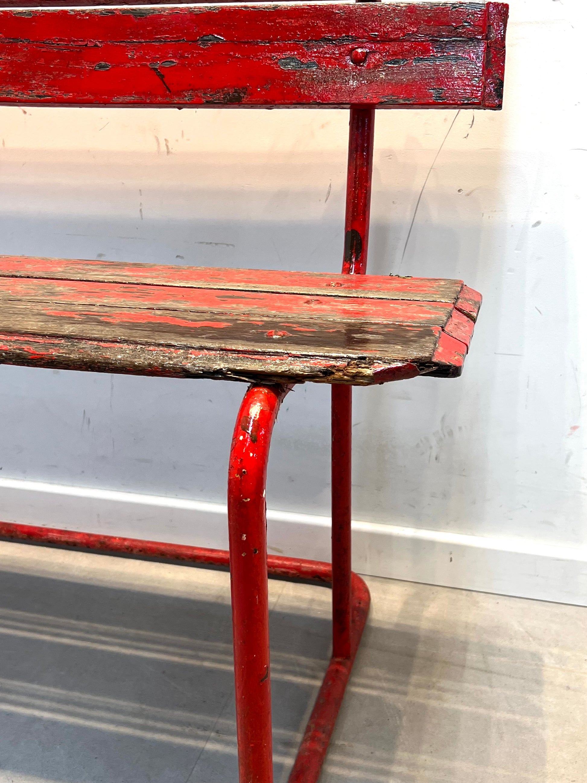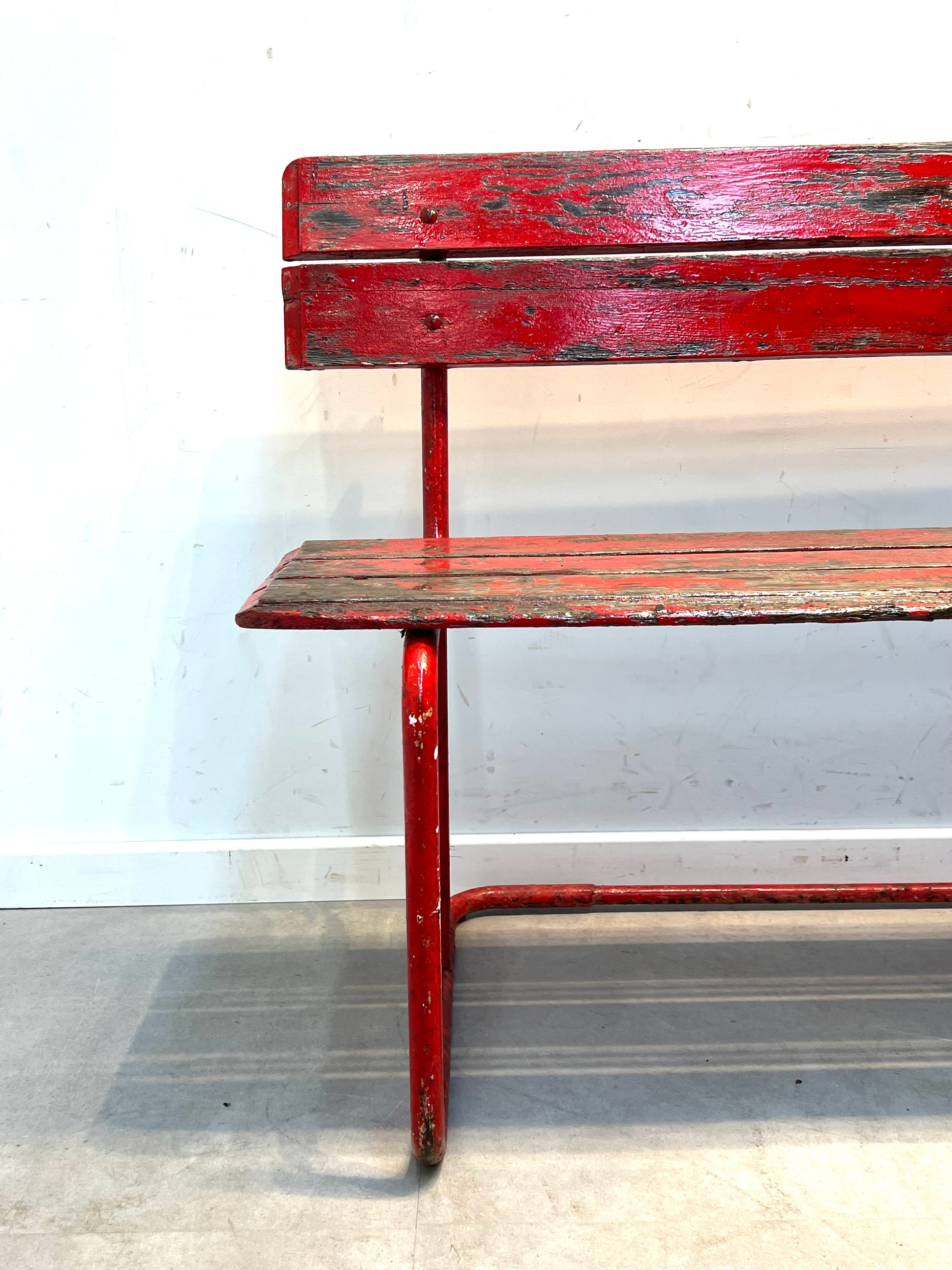 A striking vintage garden bench with a beautifully weathered red painted finish and strong industrial character. This piece combines a tubular metal frame with wooden slats, giving it an authentic rustic look full of charm and patina. The heavily worn paint and visible age marks make it a decorative statement piece, perfect for a garden, terrace, hallway, shop interior, or covered outdoor setting.
