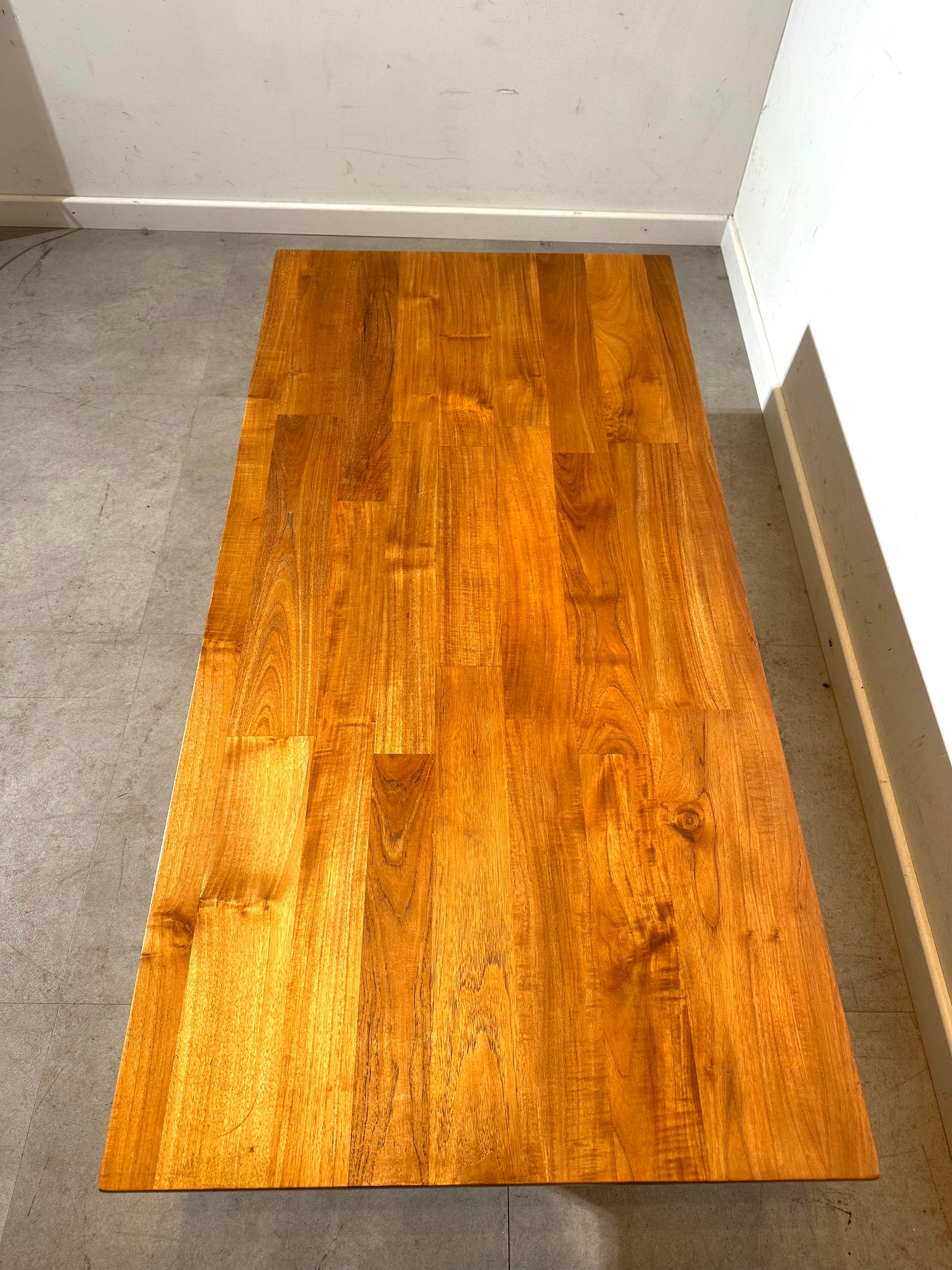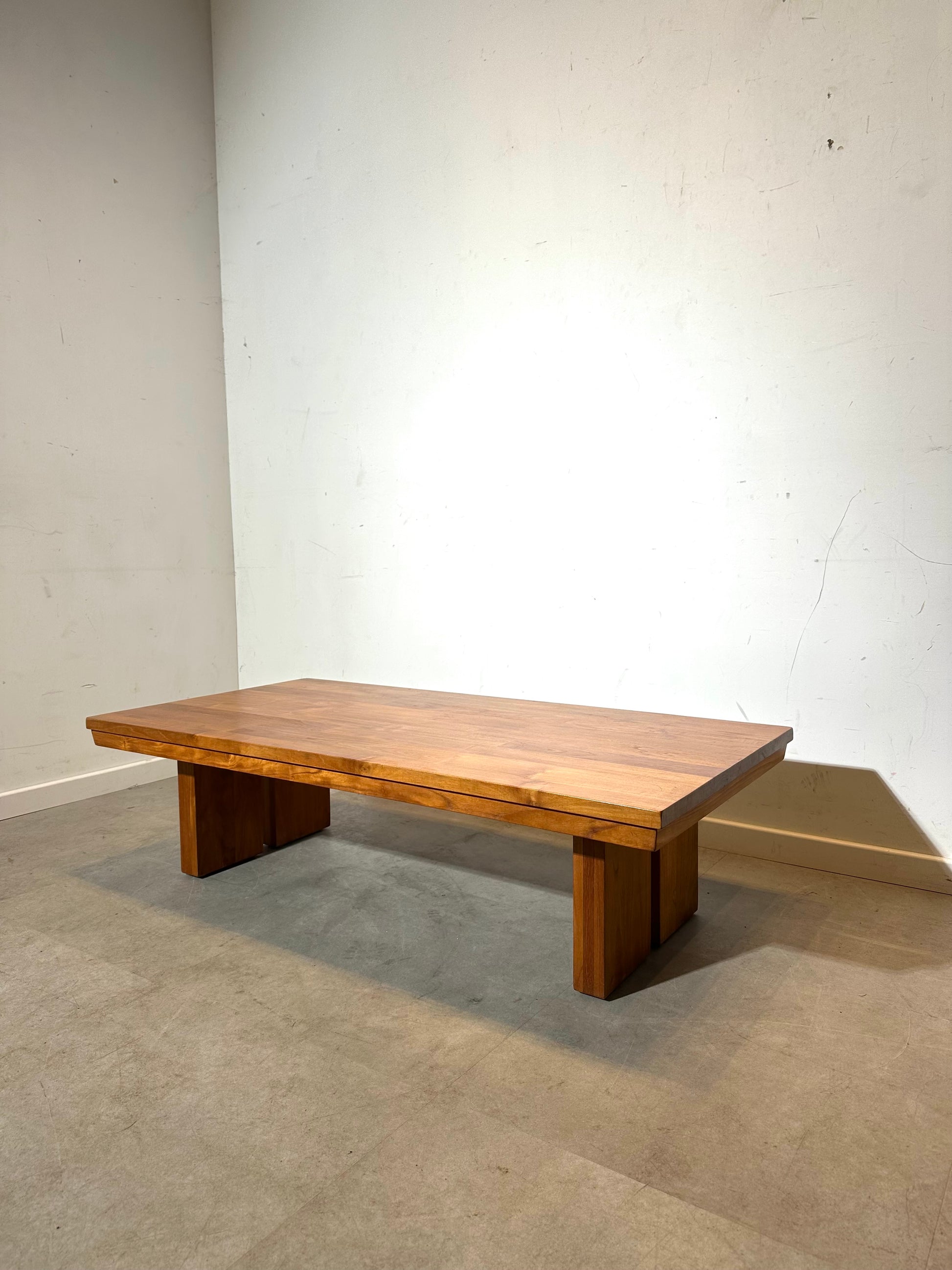 This elegant vintage coffee table is crafted from solid teak and features a strong, architectural design with clean lines and warm natural tones. The thick rectangular top beautifully showcases the rich grain of the teak, while the bold block-style legs give the table a sculptural, grounded presence.