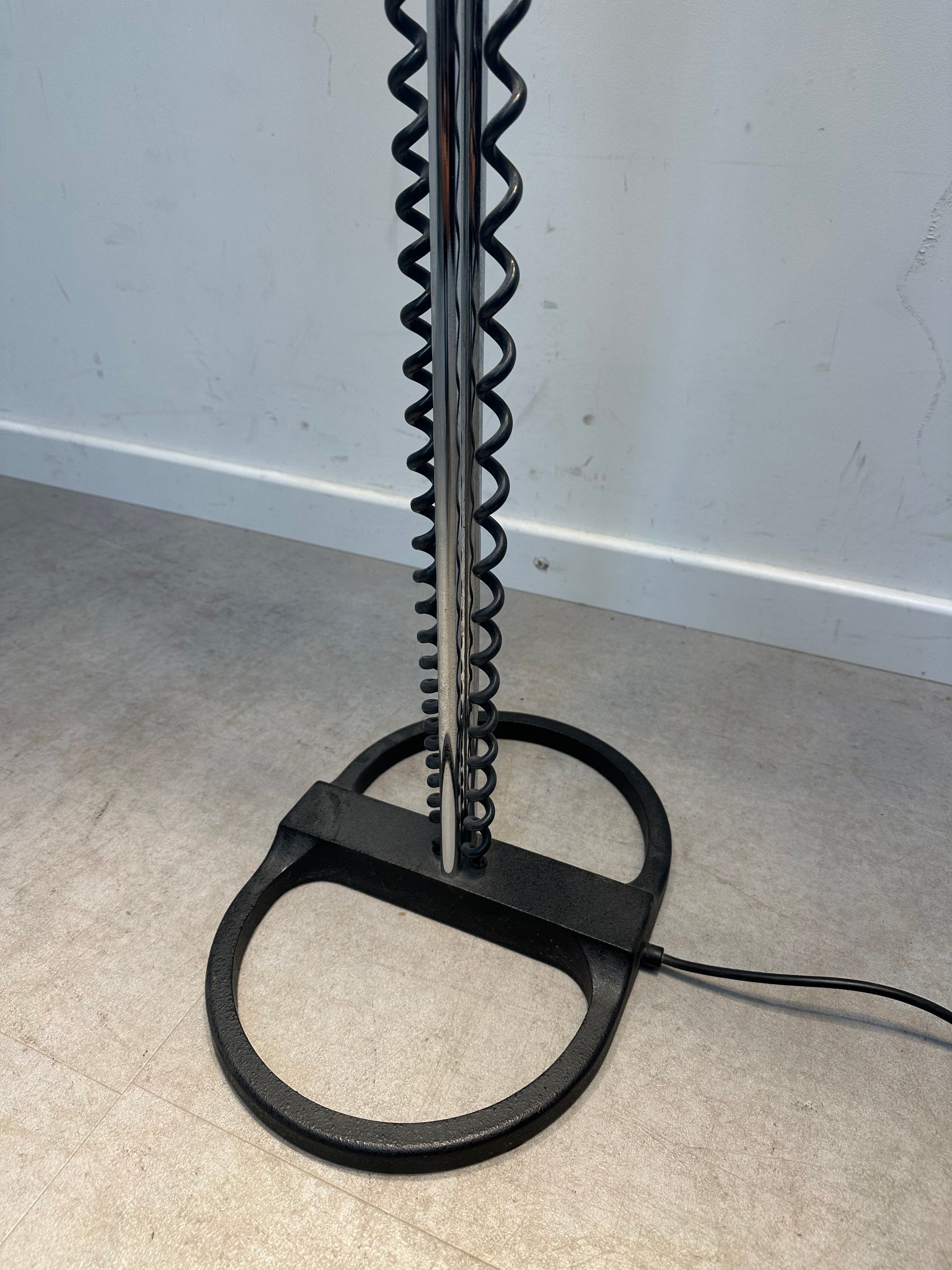 This rare design features two adjustable chrome ball spotlights mounted on a sleek chrome stem with a sculptural black double-loop base. The lamp is both functional and decorative, with its timeless space-age design and high-quality German craftsmanship.