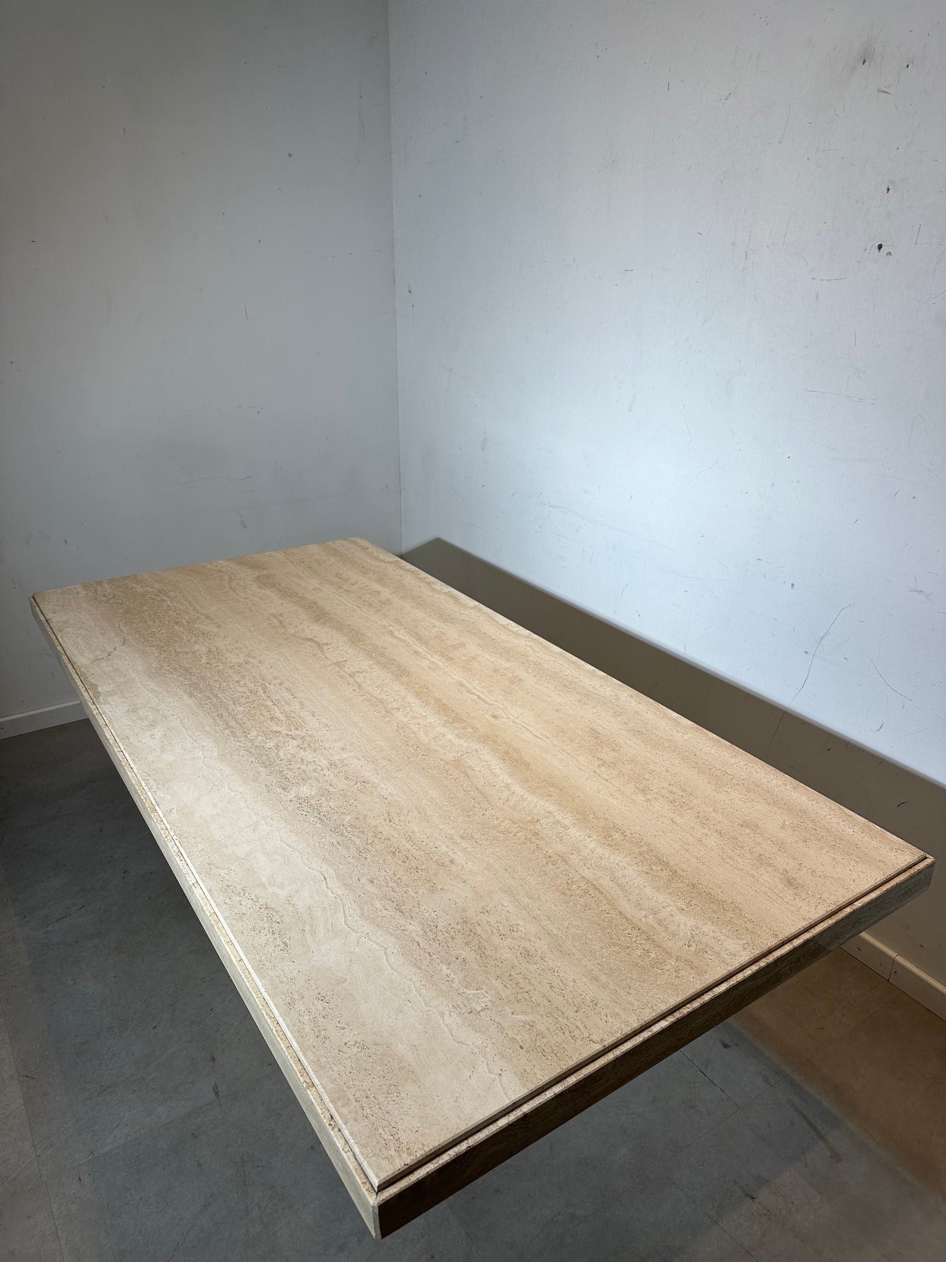 The warm beige tones and natural veining of the travertine add depth and character, making this table a perfect fit for both modern interiors and more classic or brutalist spaces. Ideal as a dining table or statement piece in a large kitchen or open living area.