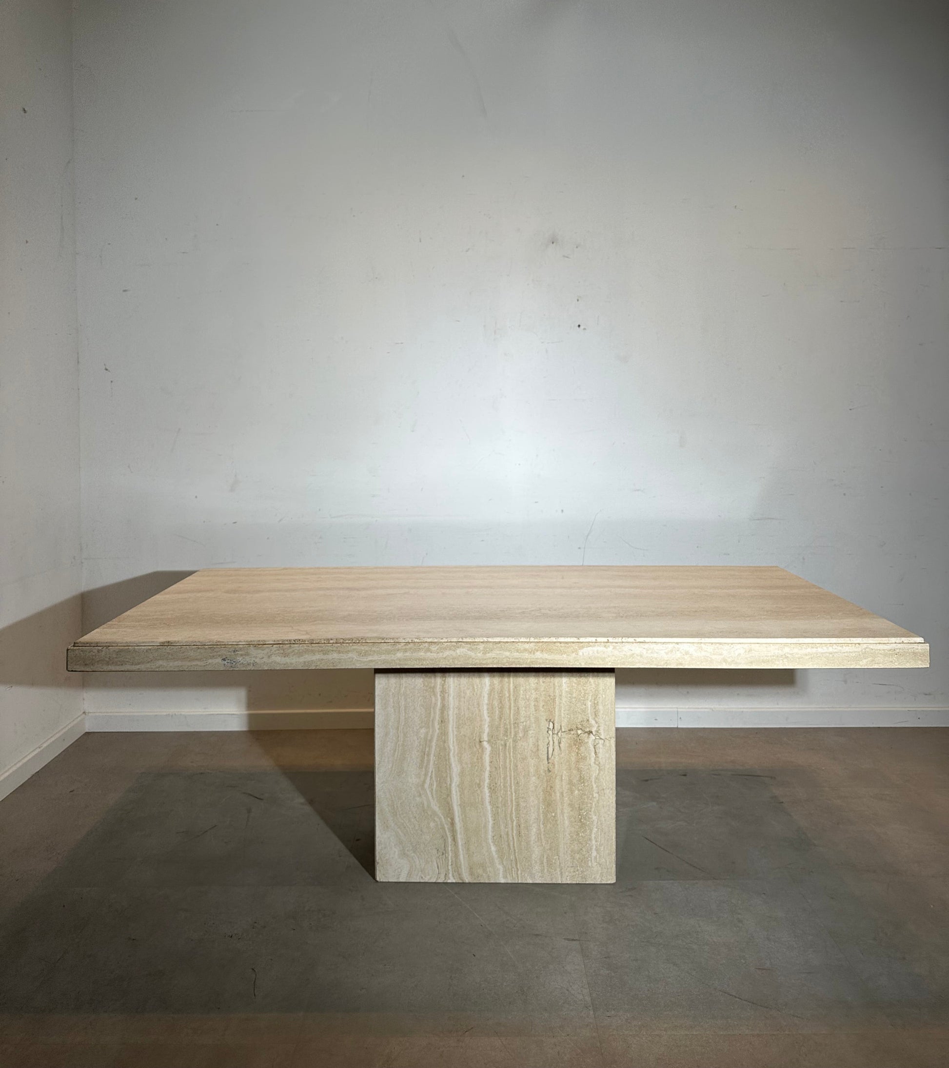 Large vintage dining table executed entirely in natural travertine stone. The design is defined by its clean rectangular top and solid central pedestal base, giving the piece a strong architectural presence while keeping the overall look calm and timeless.