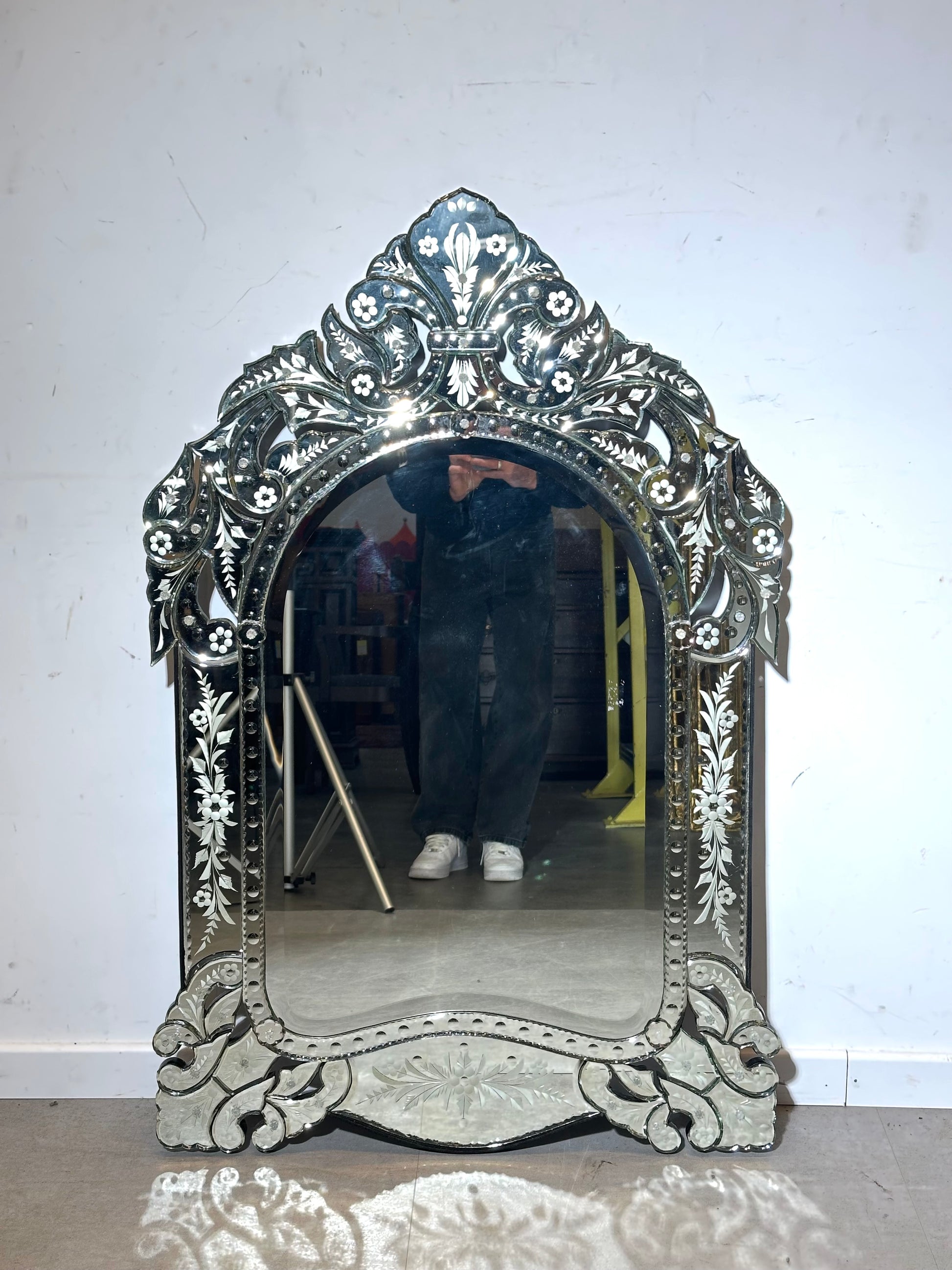 Decorative Venetian-inspired wall mirror with an ornate scalloped crest and richly etched floral motifs throughout. The frame is composed of mirrored glass panels with engraved/etched decoration, giving a classic Murano/Venetian look that catches the light beautifully. A statement piece for an entryway, bedroom, dressing area, or above a console.