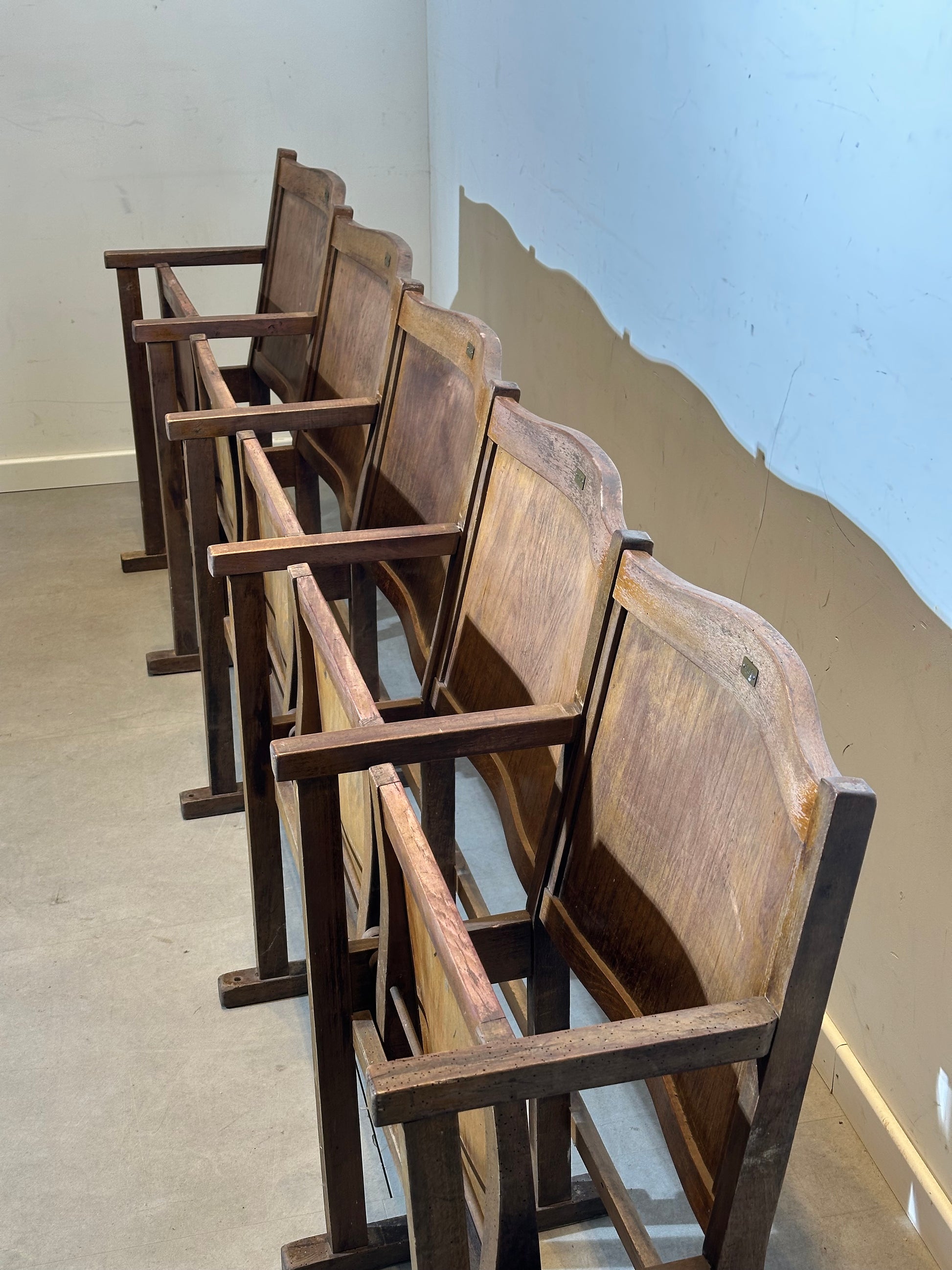 Authentic vintage cinema seating consisting of five individual wooden seats mounted on a continuous structural frame. This original piece comes from a former cinema or theatre and features a beautifully aged patina that only decades of use can create.