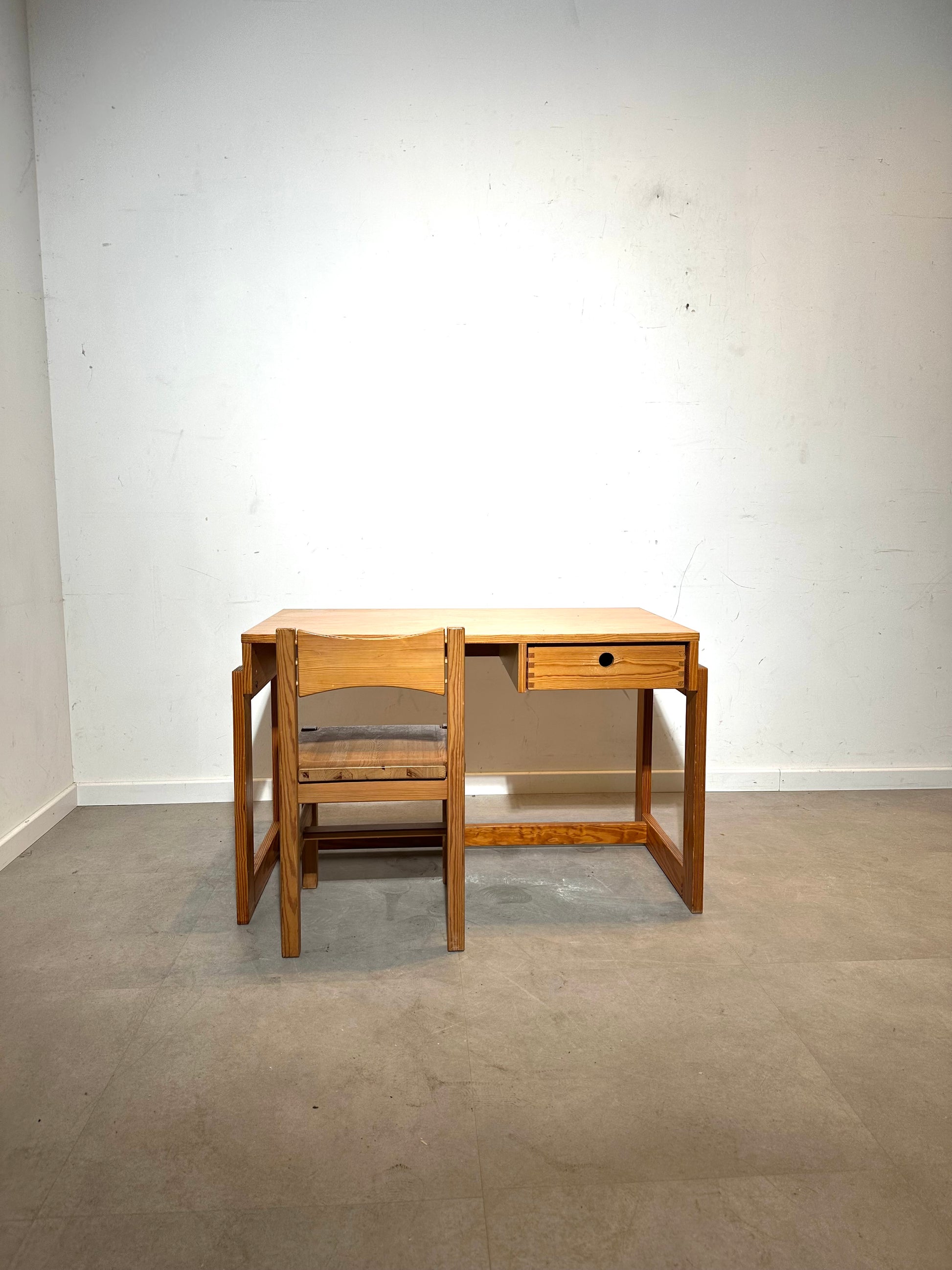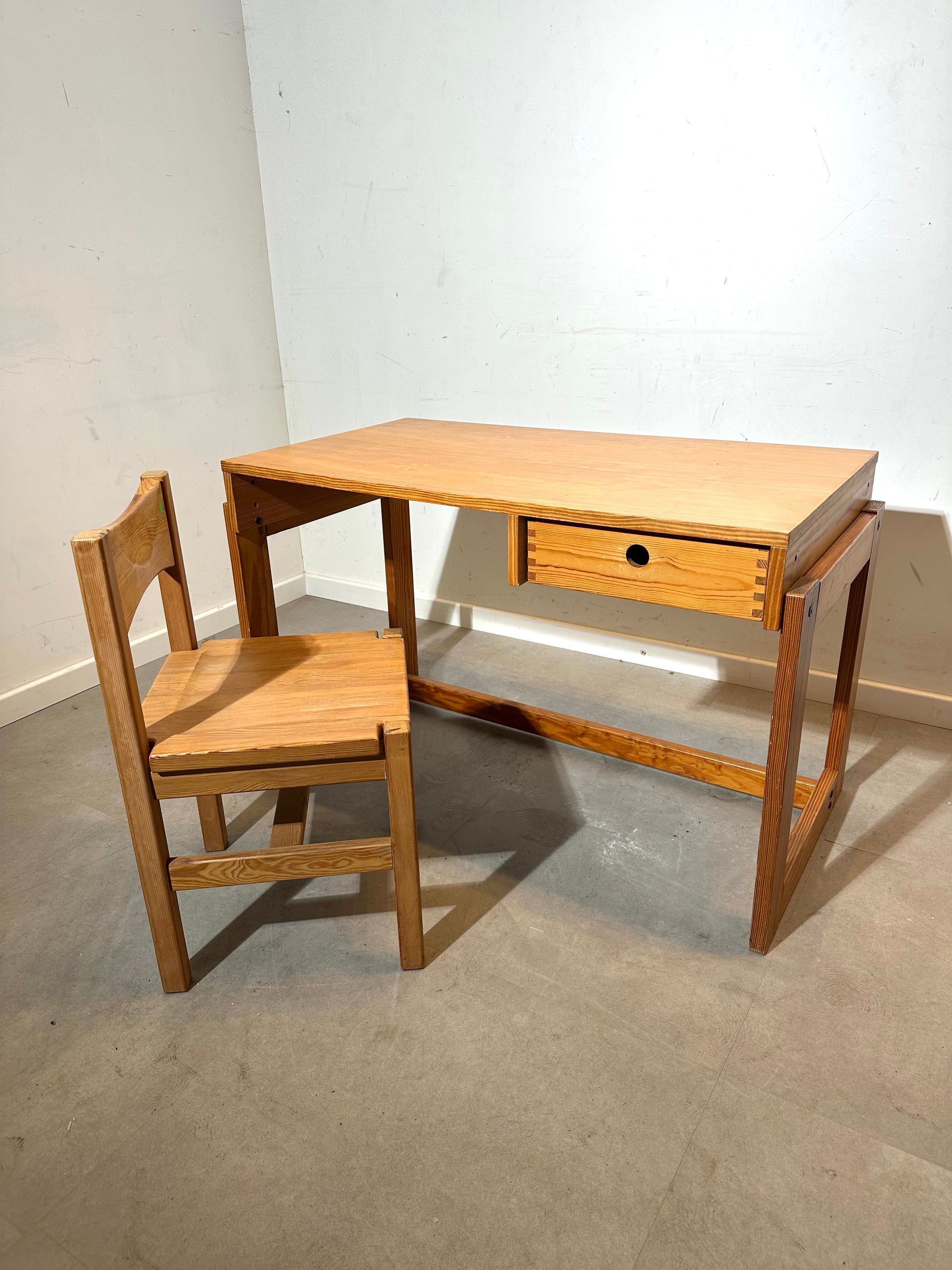 Charming vintage writing desk crafted in solid pine, accompanied by its matching wooden chair. This functional and well-balanced set features a clean, minimalist design with visible joinery and warm natural wood tones, reminiscent of Scandinavian and school furniture from the mid to late 20th century.